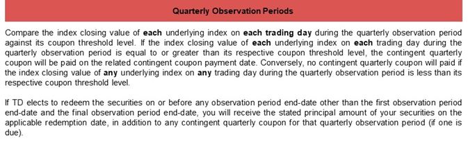 observation period is less than its coupon threshold level, we will not pay a contingent quarterly coupon with respect to that quarterly observation period.