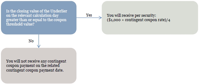 On each contingent coupon payment date, unless the securities have been automatically called, you will receive a contingent coupon payment at a per annum rate equal to the contingent coupon rate if, and only if, the closing value of the Underlier on the related calculation day is greater than or equal to the coupon threshold value.