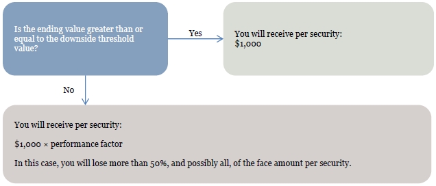 Since the hypothetical ending value is less than the hypothetical starting value, but not by more than 50%, you would receive the face amount of your securities at maturity.