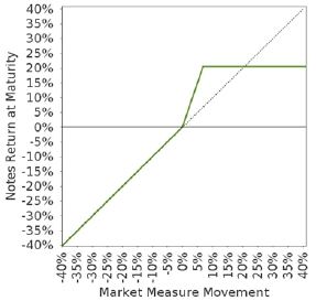 This graph reflects the returns on the notes, based on the Participation Rate of 300% and a hypothetical Capped Value of $12.05 per unit (the midpoint of the Capped Value range of [$11.85 to $12.25]). The green line reflects the returns on the notes, while the dotted gray line reflects the returns of a direct investment in the stocks included in the Index, excluding dividends.