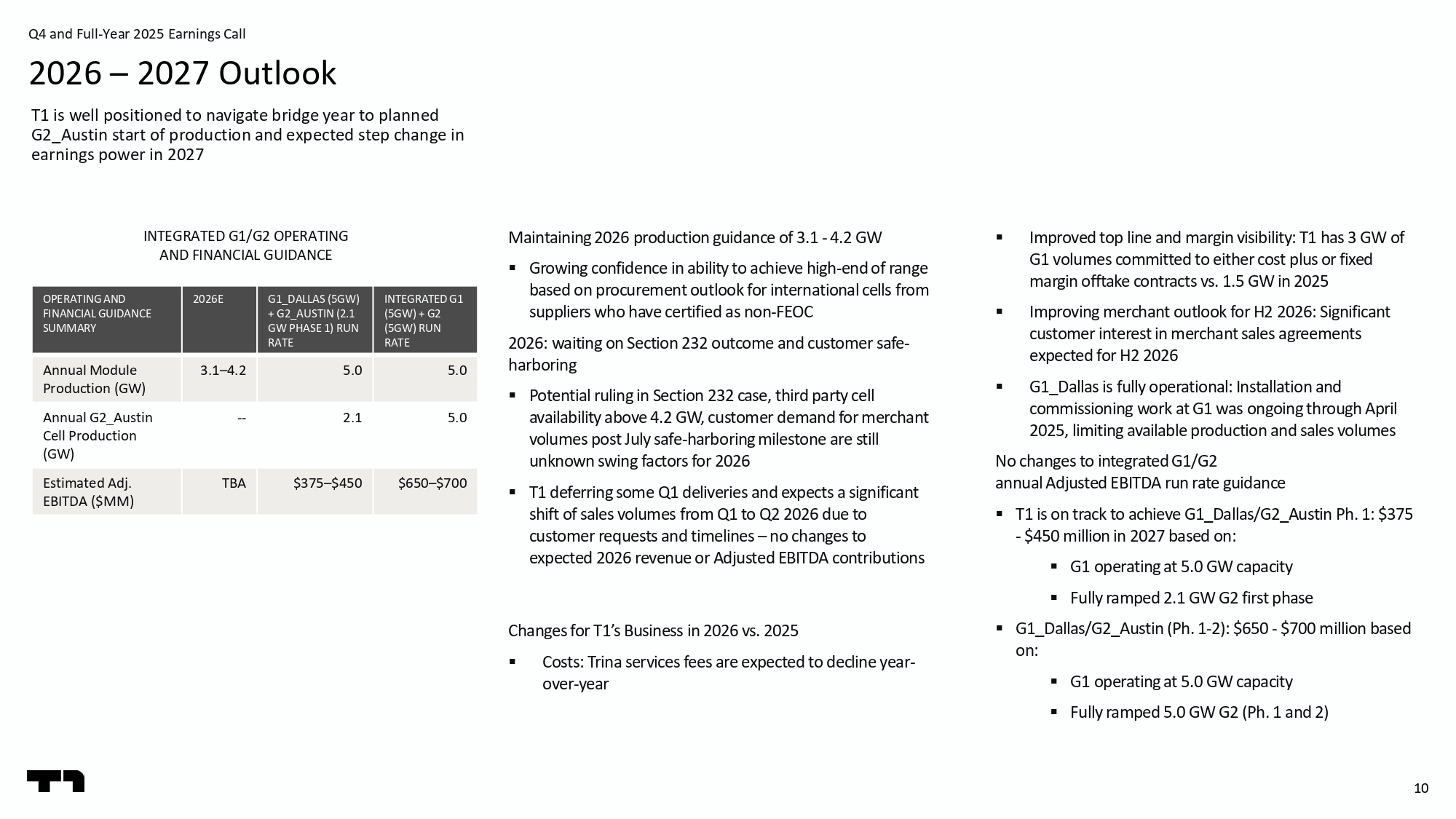 T1 is well positioned to navigate bridge year to planned G2_Austin start of production and expected step change in earnings power in 2027 10 Q4 and Full - Year 2025 Earnings Call 2026 – 2027 Outlook Maintaining 2026 production guidance of 3 . 1 - 4 . 2 GW ▪ Growing confidence in ability to achieve high - end of range based on procurement outlook for international cells from suppliers who have certified as non - FEOC 2026 : waiting on Section 232 outcome and customer safe - harboring ▪ Potential ruling in Section 232 case, third party cell availability above 4.2 GW, customer demand for merchant volumes post July safe - harboring milestone are still unknown swing factors for 2026 ▪ T1 deferring some Q1 deliveries and expects a significant shift of sales volumes from Q1 to Q2 2026 due to customer requests and timelines – no changes to expected 2026 revenue or Adjusted EBITDA contributions Changes for T1’s Business in 2026 vs. 2025 ▪ Costs: Trina services fees are expected to decline year - over - year ▪ Improved top line and margin visibility: T1 has 3 GW of G1 volumes committed to either cost plus or fixed margin offtake contracts vs. 1.5 GW in 2025 ▪ Improving merchant outlook for H2 2026: Significant customer interest in merchant sales agreements expected for H2 2026 ▪ G1_Dallas is fully operational: Installation and commissioning work at G1 was ongoing through April 2025, limiting available production and sales volumes No changes to integrated G1/G2 annual Adjusted EBITDA run rate guidance ▪ T1 is on track to achieve G1_Dallas/G2_Austin Ph. 1: $375 - $450 million in 2027 based on: ▪ G1 operating at 5.0 GW capacity ▪ Fully ramped 2.1 GW G2 first phase ▪ G1_Dallas/G2_Austin (Ph. 1 - 2): $650 - $700 million based on: ▪ G1 operating at 5.0 GW capacity ▪ Fully ramped 5.0 GW G2 (Ph. 1 and 2) INTEGRATED G1/G2 OPERATING AND FINANCIAL GUIDANCE INTEGRATED G1 (5GW) + G2 (5GW) RUN RATE G 1 _DALLAS ( 5 GW) + G 2 _AUSTIN ( 2 . 1 GW PHASE 1 ) RUN RATE 2026E OPERATING AND FINANCIAL GUIDANCE SUMMARY 5.0 5.0 3.1 – 4.2 Annual Module Production (GW) 5.0 2.1 - - Annual G2_Austin Cell Production (GW) $650 – $700 $375 – $450 TBA Estimated Adj. EBITDA ($MM)