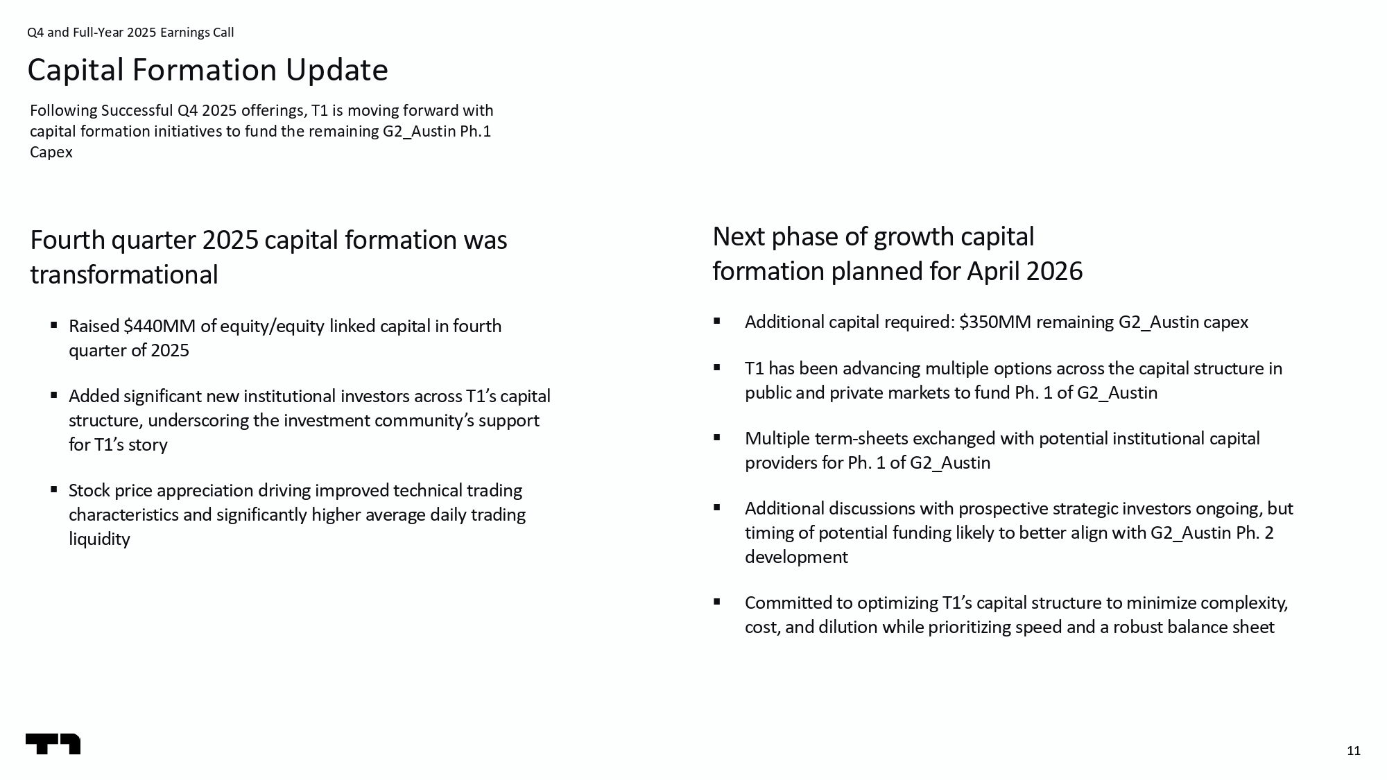 Capital Formation Update 11 Fourth quarter 2025 capital formation was transformational ▪ Raised $440MM of equity/equity linked capital in fourth quarter of 2025 ▪ Added significant new institutional investors across T1’s capital structure, underscoring the investment community’s support for T1’s story ▪ Stock price appreciation driving improved technical trading characteristics and significantly higher average daily trading liquidity Next phase of growth capital formation planned for April 2026 ▪ Additional capital required: $350MM remaining G2_Austin capex ▪ T1 has been advancing multiple options across the capital structure in public and private markets to fund Ph. 1 of G2_Austin ▪ Multiple term - sheets exchanged with potential institutional capital providers for Ph. 1 of G2_Austin ▪ Additional discussions with prospective strategic investors ongoing, but timing of potential funding likely to better align with G2_Austin Ph. 2 development ▪ Committed to optimizing T1’s capital structure to minimize complexity, cost, and dilution while prioritizing speed and a robust balance sheet Following Successful Q 4 2025 offerings, T 1 is moving forward with capital formation initiatives to fund the remaining G 2 _Austin Ph . 1 Capex Q4 and Full - Year 2025 Earnings Call
