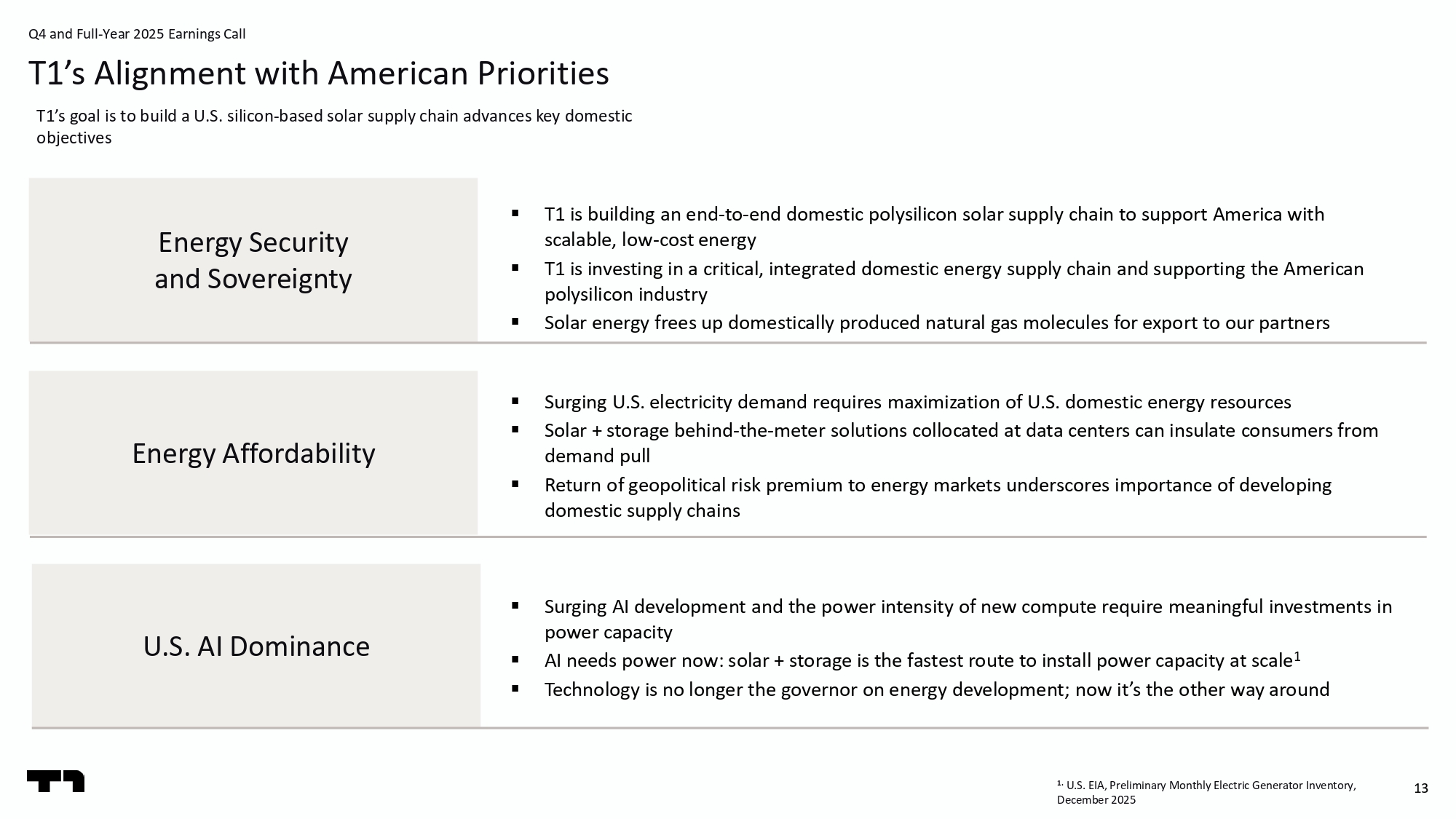 “Rising tide” effect and benefits to T1 ▪ Musk’s commitment underscores the importance of expanding the domestic solar market and is likely to generate a “rising tide” effect of demand ▪ Planned buildout validates the deployment scale the U . S . solar industry can and should achieve Q4 and Full - Year 2025 Earnings Call Commitments to Domestic Solar Benefit T1 PHOTO CREDIT: TESLA, SPACEX, XAI MARCH 2026. Elon Musk’s commitment to U.S. domestic solar and advanced manufacturing ▪ Elon Musk announced in early 2026 that his companies plan to build 100 GW of domestic solar capacity in the next several years ▪ The announcement represents one of the largest renewable energy commitments in history and a massive expansion of U . S . domestic solar ▪ Musk also recently announced plans to construct a $ 20 billion chip manufacturing Terafab in Austin ▪ Terafab could be start of a step change in electricity - intensive domestic development of chips and AI infrastructure ▪ Expanded solar + storage energy supports the onshoring of U.S. advanced manufacturing 12