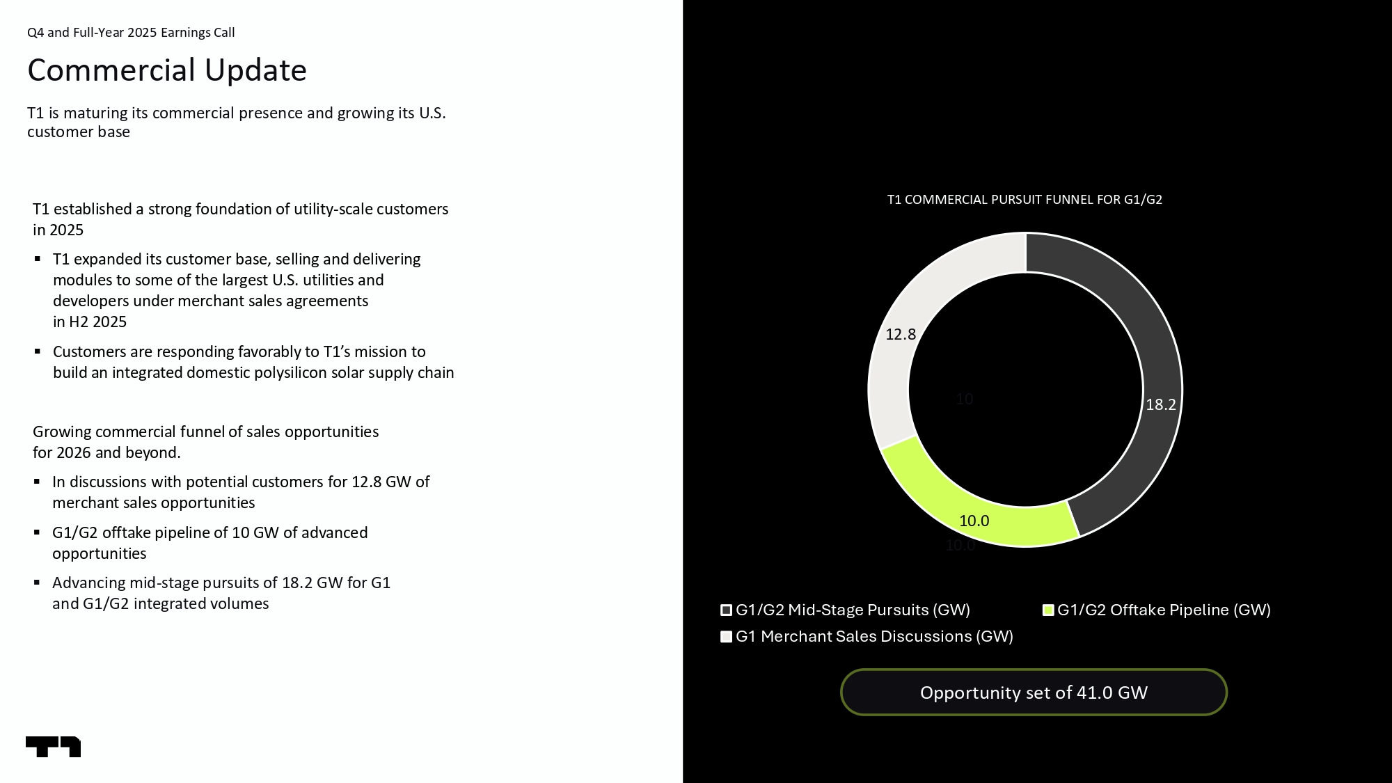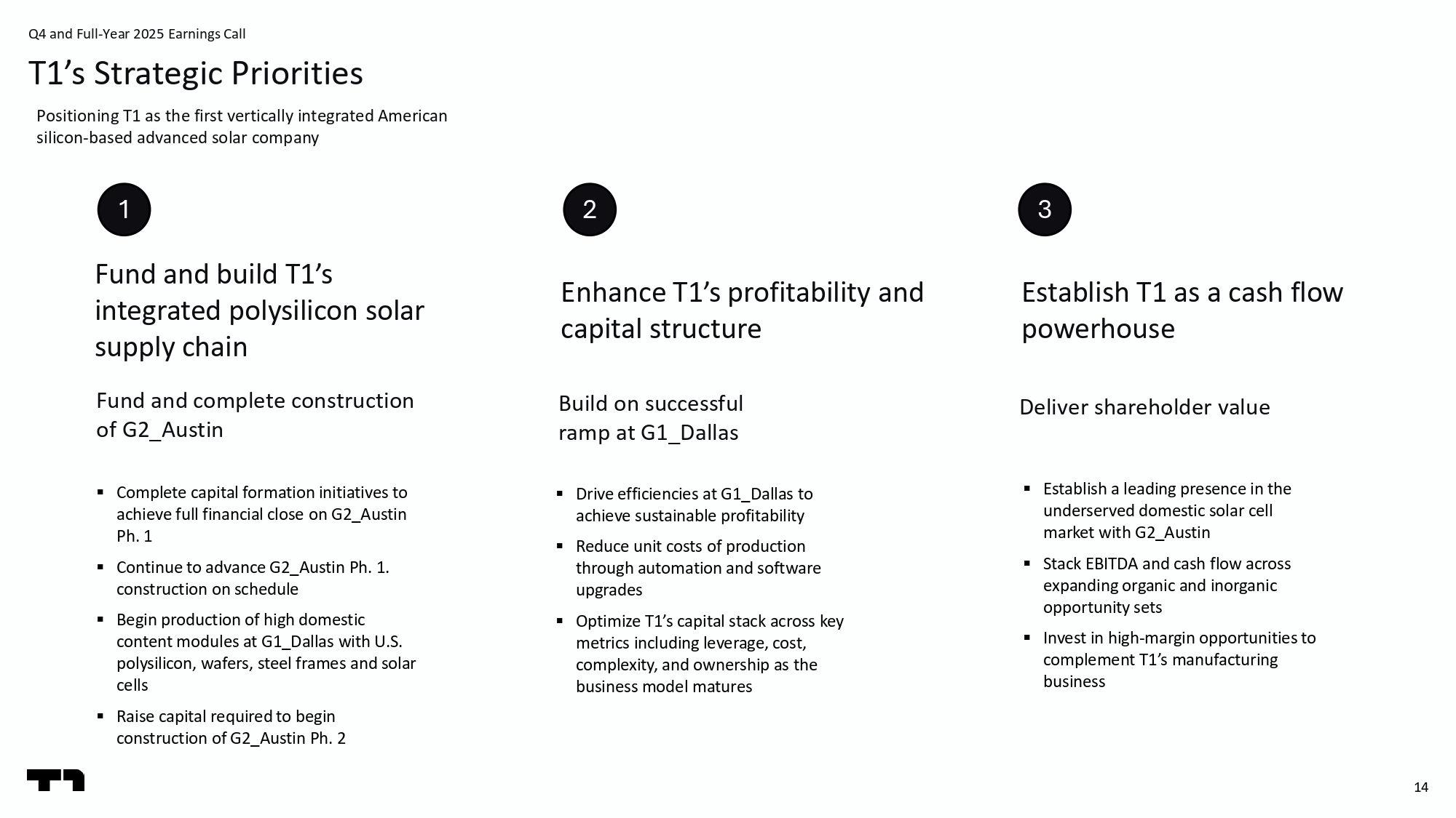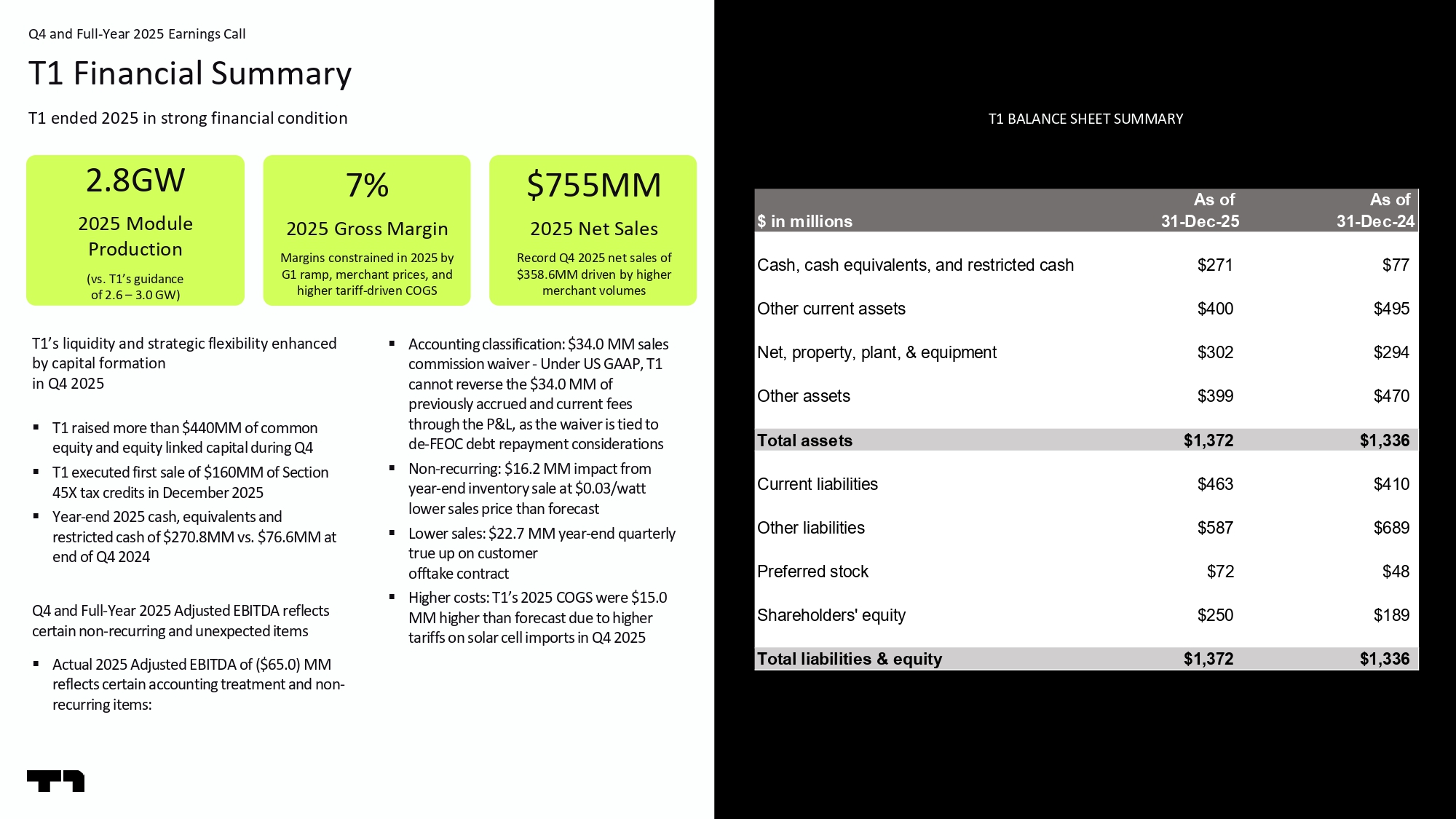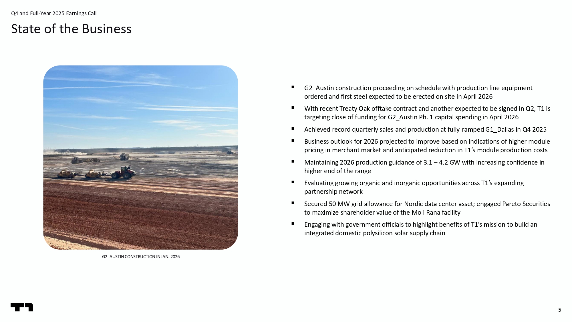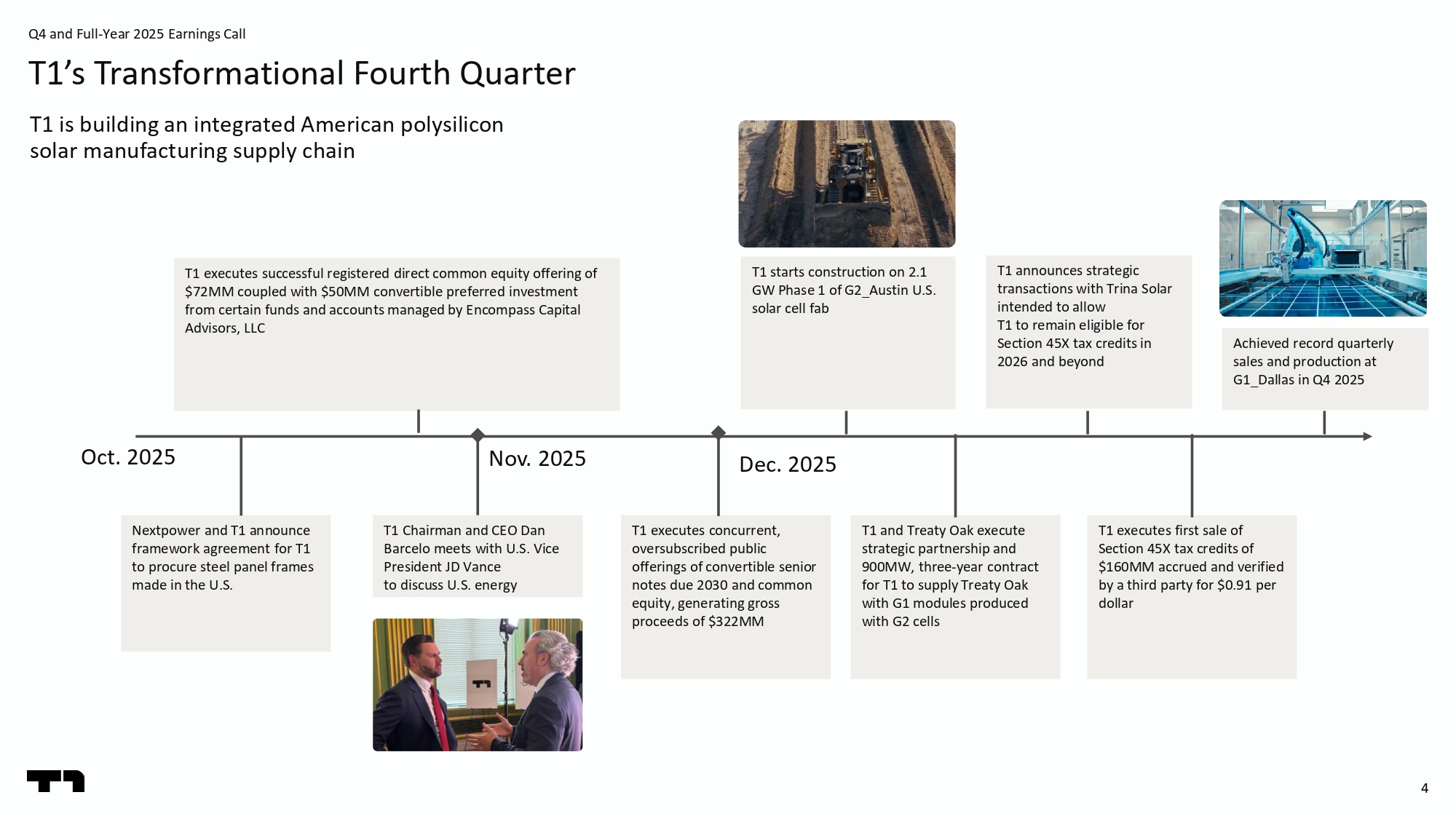 Q4 and Full - Year 2025 Earnings Call T1’s Transformational Fourth Quarter T1 is building an integrated American polysilicon solar manufacturing supply chain T 1 executes successful registered direct common equity offering of $ 72 MM coupled with $ 50 MM convertible preferred investment from certain funds and accounts managed by Encompass Capital Advisors, LLC T1 starts construction on 2.1 GW Phase 1 of G2_Austin U.S. solar cell fab T1 announces strategic transactions with Trina Solar intended to allow T1 to remain eligible for Section 45X tax credits in 2026 and beyond Achieved record quarterly sales and production at G1_Dallas in Q4 2025 Nextpower and T 1 announce framework agreement for T 1 to procure steel panel frames made in the U . S . T1 Chairman and CEO Dan Barcelo meets with U.S. Vice President JD Vance to discuss U.S. energy T1 executes concurrent, oversubscribed public offerings of convertible senior notes due 2030 and common equity, generating gross proceeds of $322MM T1 and Treaty Oak execute strategic partnership and 900MW, three - year contract for T1 to supply Treaty Oak with G1 modules produced with G2 cells T1 executes first sale of Section 45X tax credits of $160MM accrued and verified by a third party for $0.91 per dollar Oct. 2025 Nov. 2025 Dec. 2025 4