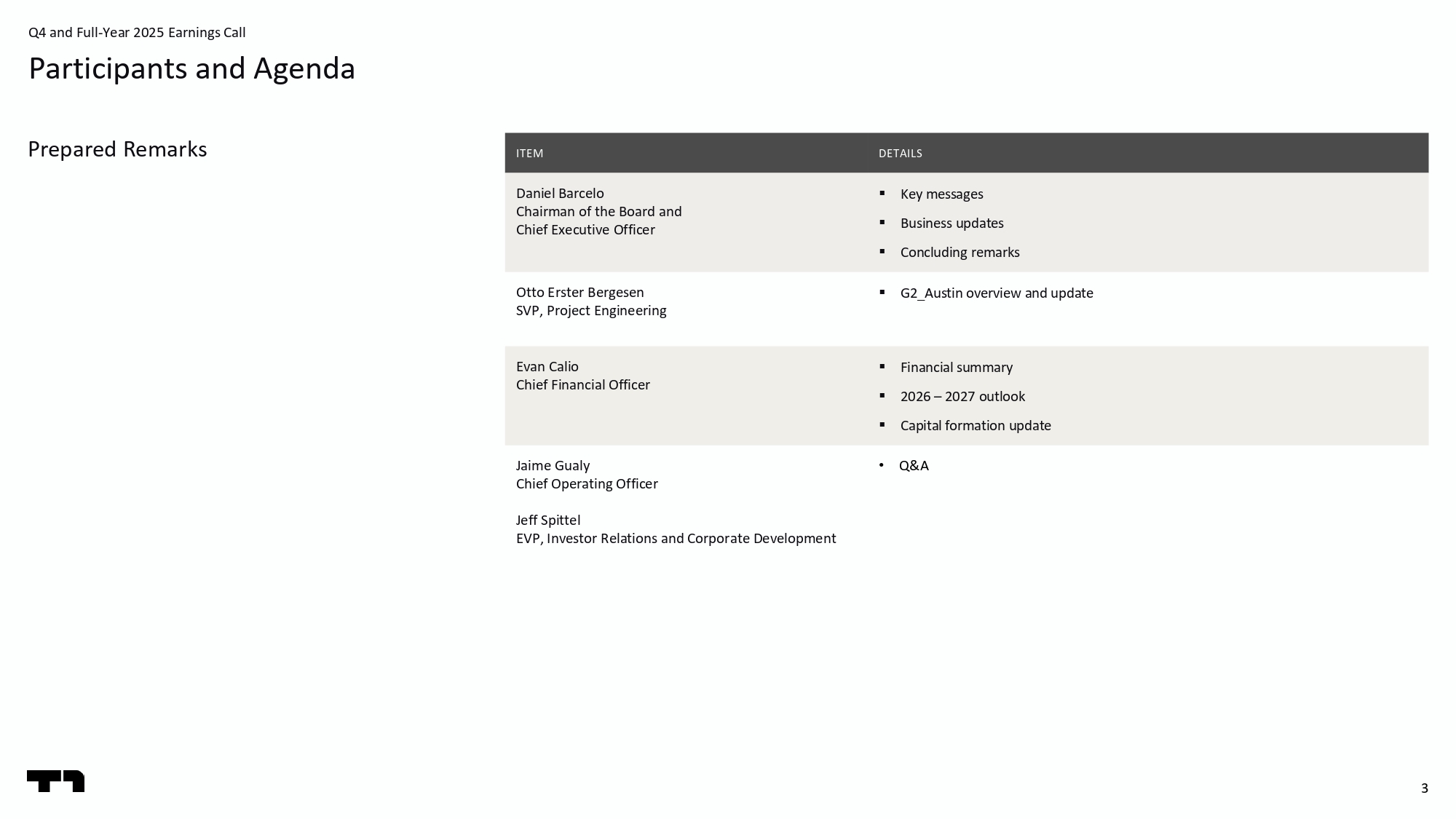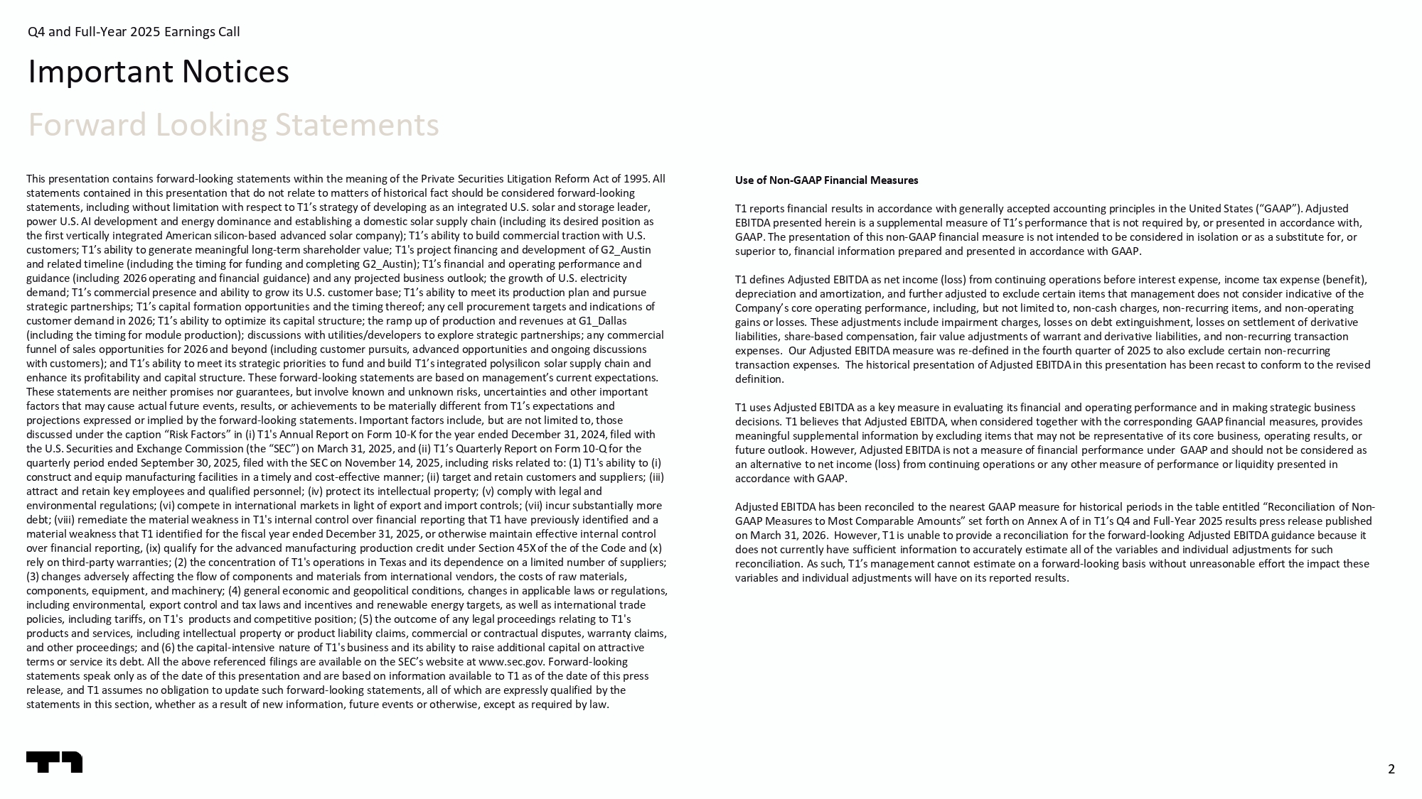 Q4 and Full - Year 2025 Earnings Call 2 This presentation contains forward - looking statements within the meaning of the Private Securities Litigation Reform Act of 1995. All statements contained in this presentation that do not relate to matters of historical fact should be considered forward - looking statements, including without limitation with respect to T1’s strategy of developing as an integrated U.S. solar and storage leader, power U.S. AI development and energy dominance and establishing a domestic solar supply chain (including its desired position as the first vertically integrated American silicon - based advanced solar company); T1’s ability to build commercial traction with U.S. customers; T1’s ability to generate meaningful long - term shareholder value; T1's project financing and development of G2_Austin and related timeline (including the timing for funding and completing G2_Austin); T1’s financial and operating performance and guidance (including 2026 operating and financial guidance) and any projected business outlook; the growth of U.S. electricity demand; T1’s commercial presence and ability to grow its U.S. customer base; T1’s ability to meet its production plan and pursue strategic partnerships; T1’s capital formation opportunities and the timing thereof; any cell procurement targets and indications of customer demand in 2026; T1’s ability to optimize its capital structure; the ramp up of production and revenues at G1_Dallas (including the timing for module production); discussions with utilities/developers to explore strategic partnerships; any commercial funnel of sales opportunities for 2026 and beyond (including customer pursuits, advanced opportunities and ongoing discussions with customers); and T1’s ability to meet its strategic priorities to fund and build T1’s integrated polysilicon solar supply chain and enhance its profitability and capital structure. These forward - looking statements are based on management’s current expectations. These statements are neither promises nor guarantees, but involve known and unknown risks, uncertainties and other important factors that may cause actual future events, results, or achievements to be materially different from T1’s expectations and projections expressed or implied by the forward - looking statements. Important factors include, but are not limited to, those discussed under the caption “Risk Factors” in (i) T1's Annual Report on Form 10 - K for the year ended December 31, 2024, filed with the U.S. Securities and Exchange Commission (the “SEC”) on March 31, 2025, and (ii) T1’s Quarterly Report on Form 10 - Q for the quarterly period ended September 30, 2025, filed with the SEC on November 14, 2025, including risks related to: (1) T1's ability to (i) construct and equip manufacturing facilities in a timely and cost - effective manner; (ii) target and retain customers and suppliers; (iii) attract and retain key employees and qualified personnel; (iv) protect its intellectual property; (v) comply with legal and environmental regulations; (vi) compete in international markets in light of export and import controls; (vii) incur substantially more debt; (viii) remediate the material weakness in T1's internal control over financial reporting that T1 have previously identified and a material weakness that T1 identified for the fiscal year ended December 31, 2025, or otherwise maintain effective internal control over financial reporting, (viii) qualify for the advanced manufacturing production credit under Section 45X of the of the Code and (ix) rely on third - party warranties; (2) the concentration of T1's operations in Texas and its dependence on a limited number of suppliers; (3) changes adversely affecting the flow of components and materials from international vendors, the costs of raw materials, components, equipment, and machinery; (4) general economic and geopolitical conditions, changes in applicable laws or regulations, including environmental, export control and tax laws and incentives and renewable energy targets, as well as international trade policies, including tariffs, on T1's products and competitive position; (5) the outcome of any legal proceedings relating to T1's products and services, including intellectual property or product liability claims, commercial or contractual disputes, warranty claims, and other proceedings; and (6) the capital - intensive nature of T1's business and its ability to raise additional capital on attractive terms or service its debt. All the above referenced filings are available on the SEC’s website at www.sec.gov. Forward - looking statements speak only as of the date of this presentation and are based on information available to T1 as of the date of this press release, and T1 assumes no obligation to update such forward - looking statements, all of which are expressly qualified by the statements in this section, whether as a result of new information, future events or otherwise, except as required by law. Use of Non - GAAP Financial Measures T1 reports financial results in accordance with generally accepted accounting principles in the United States (“GAAP”). Adjusted EBITDA presented herein is a supplemental measure of T1’s performance that is not required by, or presented in accordance with, GAAP. The presentation of this non - GAAP financial measure is not intended to be considered in isolation or as a substitute for, or superior to, financial information prepared and presented in accordance with GAAP. T1 defines Adjusted EBITDA as net income (loss) from continuing operations before interest expense, income tax expense (benefit), depreciation and amortization, and further adjusted to exclude certain items that management does not consider indicative of the Company’s core operating performance, including, but not limited to, non - cash charges, non - recurring items, and non - operating gains or losses. These adjustments inclu