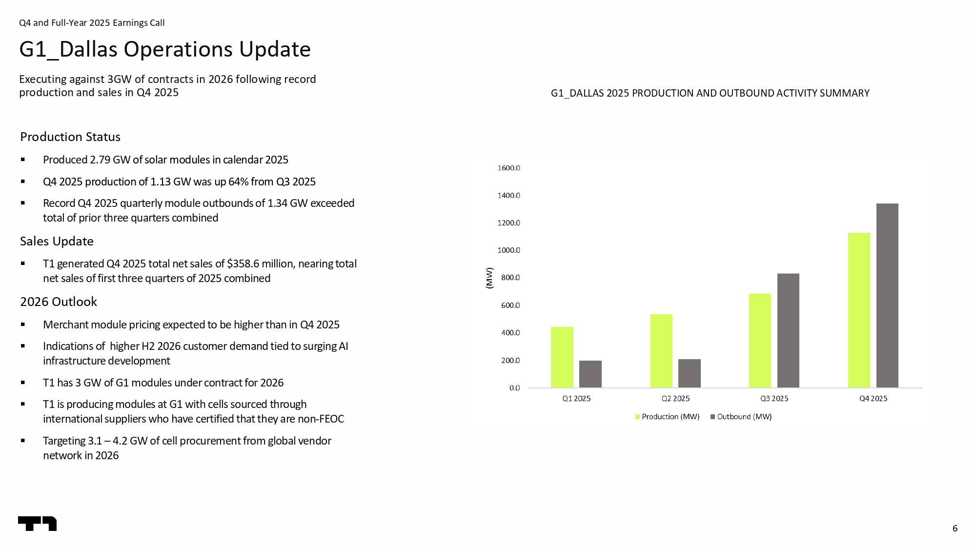 Q4 and Full - Year 2025 Earnings Call State of the Business G2_AUSTIN CONSTRUCTION IN JAN. 2026 5 ▪ G2_Austin construction proceeding on schedule with production line equipment ordered and first steel expected to be erected on site in April 2026 ▪ With recent Treaty Oak offtake contract and another expected to be signed in Q2, T1 is targeting close of funding for G2_Austin Ph. 1 capital spending in April 2026 ▪ Achieved record quarterly sales and production at fully - ramped G1_Dallas in Q4 2025 ▪ Business outlook for 2026 projected to improve based on indications of higher module pricing in merchant market and anticipated reduction in T1’s module production costs ▪ Maintaining 2026 production guidance of 3.1 – 4.2 GW with increasing confidence in higher end of the range ▪ Evaluating growing organic and inorganic opportunities across T1’s expanding partnership network ▪ Secured 50 MW grid allowance for Nordic data center asset; engaged Pareto Securities to maximize shareholder value of the Mo i Rana facility ▪ Engaging with government officials to highlight benefits of T1’s mission to build an integrated domestic polysilicon solar supply chain