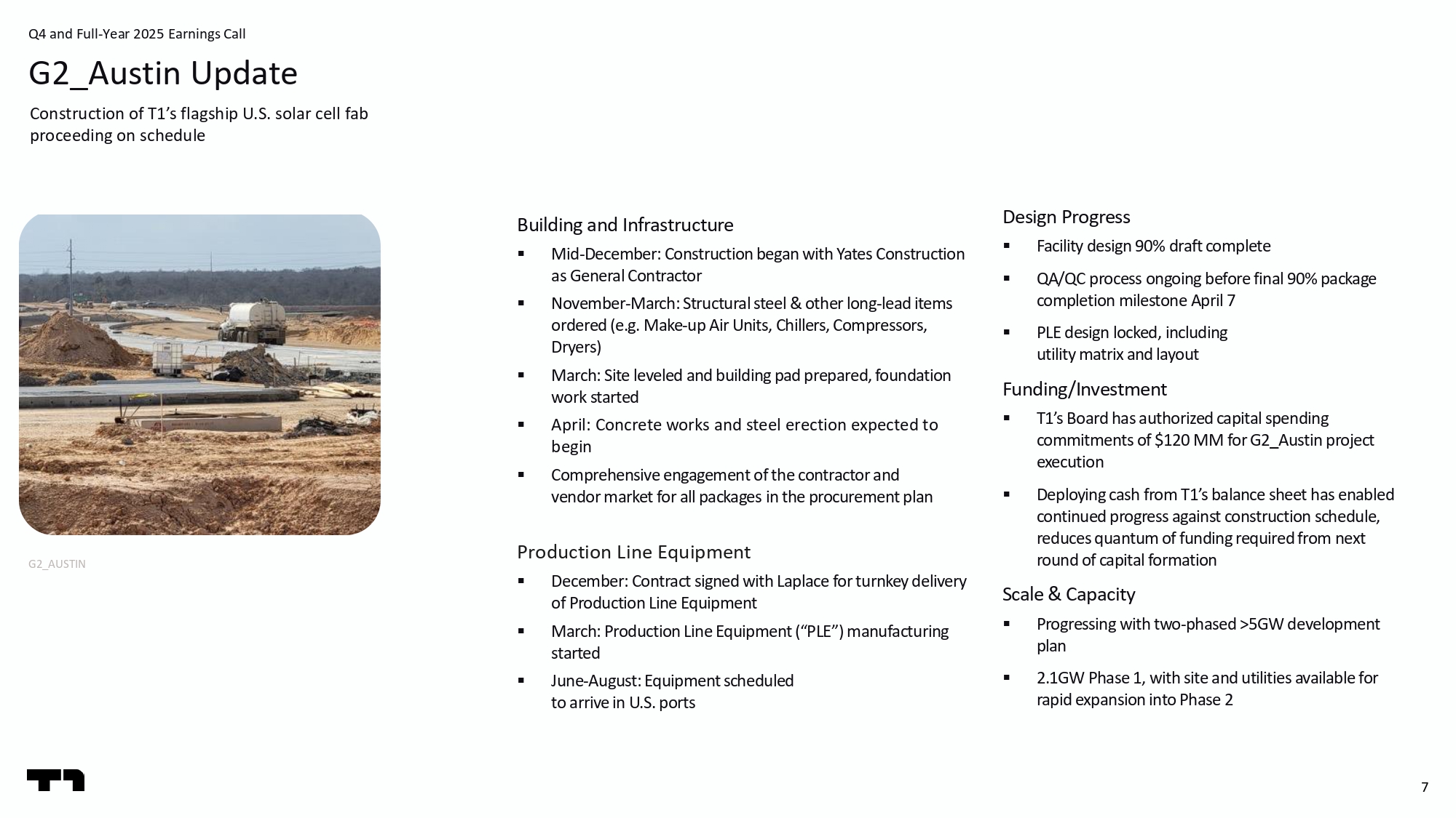 Q4 and Full - Year 2025 Earnings Call G1_Dallas Operations Update Executing against 3GW of contracts in 2026 following record production and sales in Q4 2025 Production Status ▪ Produced 2.79 GW of solar modules in calendar 2025 ▪ Q4 2025 production of 1.13 GW was up 64% from Q3 2025 ▪ Record Q4 2025 quarterly module outbounds of 1.34 GW exceeded total of prior three quarters combined Sales Update ▪ T1 generated Q4 2025 total net sales of $358.6 million, nearing total net sales of first three quarters of 2025 combined 2026 Outlook ▪ Merchant module pricing expected to be higher than in Q4 2025 ▪ Indications of higher H2 2026 customer demand tied to surging AI infrastructure development ▪ T1 has 3 GW of G1 modules under contract for 2026 ▪ T1 is producing modules at G1 with cells sourced through international suppliers who have certified that they are non - FEOC ▪ Targeting 3.1 – 4.2 GW of cell procurement from global vendor network in 2026 G1_DALLAS 2025 PRODUCTION AND OUTBOUND ACTIVITY SUMMARY 6