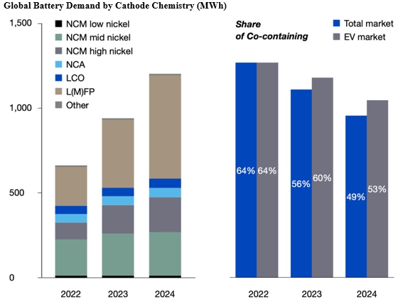 The current split of battery chemistries is divided almost evenly between cobalt-containing cathodes (NCM, nickel-cobalt-manganese; NCA, nickel-cobalt-aluminum; and LCO, lithium-cobalt oxide) and cathodes without cobalt (LFP, lithium-iron-phosphate).