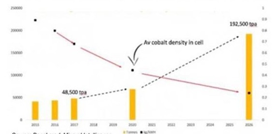 Cobalt Demand (tpa) vs Average Cobalt Density in Battery Cells (kg/kWH)