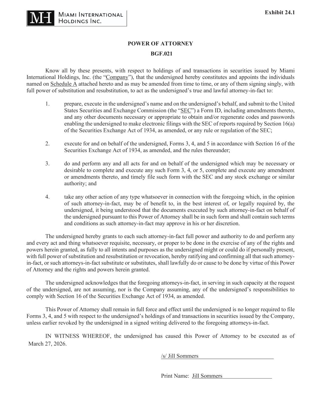 POWER OF ATTORNEY BGF.021 Know all by these presents, with respect to holdings of and transactions in securities issued by Miami International Holdings, Inc. (the “Company”), that the undersigned hereby constitutes and appoints the individuals named on Schedule A attached hereto and as may be amended from time to time, or any of them signing singly, with full power of substitution and resubstitution, to act as the undersigned’s true and lawful attorney-in-fact to: 1. prepare, execute in the undersigned’s name and on the undersigned’s behalf, and submit to the United States Securities and Exchange Commission (the “SEC”) a Form ID, including amendments thereto, and any other documents necessary or appropriate to obtain and/or regenerate codes and passwords enabling the undersigned to make electronic filings with the SEC of reports required by Section 16(a) of the Securities Exchange Act of 1934, as amended, or any rule or regulation of the SEC; 2. execute for and on behalf of the undersigned, Forms 3, 4, and 5 in accordance with Section 16 of the Securities Exchange Act of 1934, as amended, and the rules thereunder; 3. do and perform any and all acts for and on behalf of the undersigned which may be necessary or desirable to complete and execute any such Form 3, 4, or 5, complete and execute any amendment or amendments thereto, and timely file such form with the SEC and any stock exchange or similar authority; and 4. take any other action of any type whatsoever in connection with the foregoing which, in the opinion of such attorney-in-fact, may be of benefit to, in the best interest of, or legally required by, the undersigned, it being understood that the documents executed by such attorney-in-fact on behalf of the undersigned pursuant to this Power of Attorney shall be in such form and shall contain such terms and conditions as such attorney-in-fact may approve in his or her discretion. The undersigned hereby grants to each such attorney-in-fact full power and authority to do and perform any and every act and thing whatsoever requisite, necessary, or proper to be done in the exercise of any of the rights and powers herein granted, as fully to all intents and purposes as the undersigned might or could do if personally present, with full power of substitution and resubstitution or revocation, hereby ratifying and confirming all that such attorney- in-fact, or such attorneys-in-fact substitute or substitutes, shall lawfully do or cause to be done by virtue of this Power of Attorney and the rights and powers herein granted. The undersigned acknowledges that the foregoing attorneys-in-fact, in serving in such capacity at the request of the undersigned, are not assuming, nor is the Company assuming, any of the undersigned’s responsibilities to comply with Section 16 of the Securities Exchange Act of 1934, as amended. This Power of Attorney shall remain in full force and effect until the undersigned is no longer required to file Forms 3, 4, and 5 with respect to the undersigned’s holdings of and transactions in securities issued by the Company, unless earlier revoked by the undersigned in a signed writing delivered to the foregoing attorneys-in-fact. IN WITNESS WHEREOF, the undersigned has caused this Power of Attorney to be executed as of /s/ Jill Sommers__________________________ Print Name: Jill Sommers March 27, 2026. Exhibit 24.1