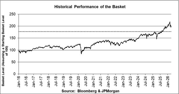 The following graph shows the daily hypothetical performance of the Basket from January 4, 2016 through March 27, 2026, assuming that the closing level of the Basket on January 4, 2016 was 100 and that the Underlyings on those dates were weighted as specified in the “Final Terms” in this pricing supplement. The dotted line represents a hypothetical Downside Threshold of 177.45, equal to 90% of the hypothetical closing level of the Basket on March 27, 2026. The hypothetical historical daily Basket performance data in this graph was determined using the closing levels of each Underlying reported by the Bloomberg Professional® service (“Bloomberg”) for those dates, without independent verification. The hypothetical historical performance of the Basket displayed below is a reflection of the aggregated historical performance of the Underlyings as described above.