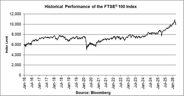 The graph below illustrates the daily performance of the FTSE® 100 Index from January 4, 2016 through March 27, 2026, based on information from Bloomberg, without independent verification. The closing level of the FTSE® 100 Index on March 27, 2026 was 9,967.35. We obtained the closing levels of the FTSE® 100 Index above and below from Bloomberg, without independent verification.