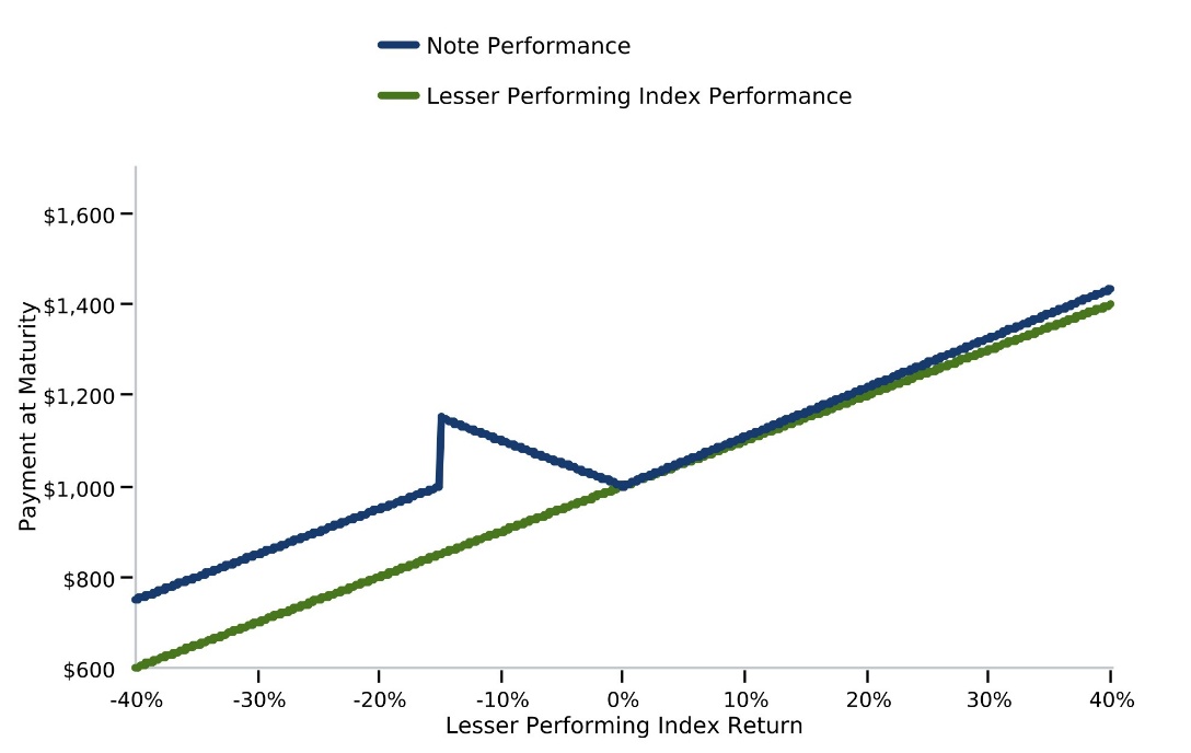 If (i) the Final Value of one Index is greater than its Initial Value and the Final Value of the other Index is equal to its Initial Value or is less than its Initial Value by up to the Buffer Amount of 15.00% or (ii) the Final Value of each Index is equal to its Initial Value or is less than its Initial Value by up to the Buffer Amount of 15.00%, investors will receive at maturity the $1,000 principal amount plus a return equal to the Absolute Index Return of the Lesser Performing Index.