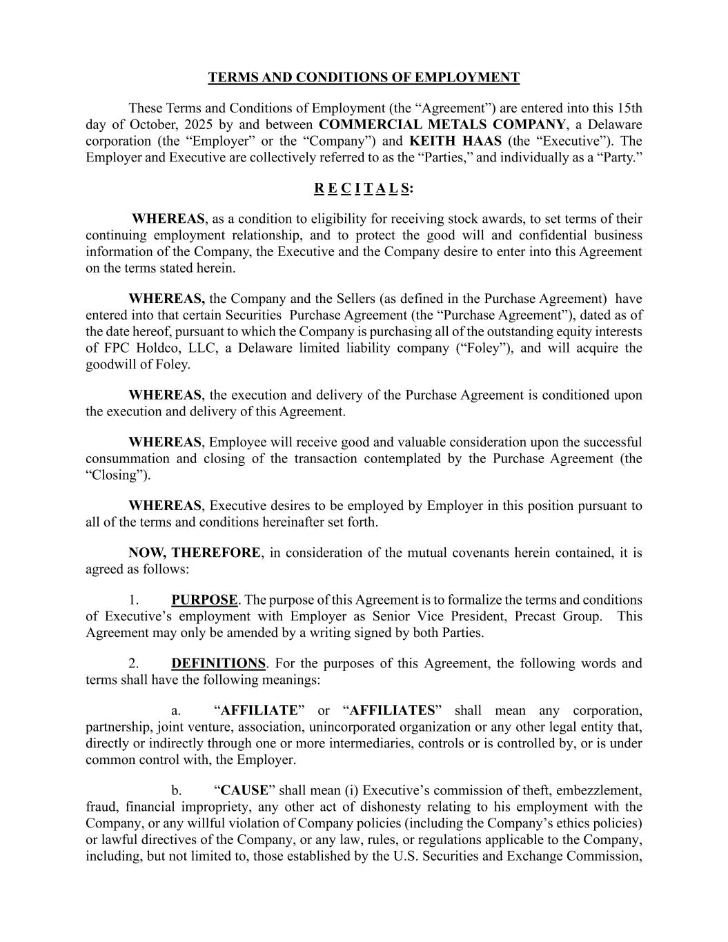 TERMS AND CONDITIONS OF EMPLOYMENT These Terms and Conditions of Employment (the “Agreement”) are entered into this 15th day of October, 2025 by and between COMMERCIAL METALS COMPANY, a Delaware corporation (the “Employer” or the “Company”) and KEITH HAAS (the “Executive”). The Employer and Executive are collectively referred to as the “Parties,” and individually as a “Party.” R E C I T A L S: WHEREAS, as a condition to eligibility for receiving stock awards, to set terms of their continuing employment relationship, and to protect the good will and confidential business information of the Company, the Executive and the Company desire to enter into this Agreement on the terms stated herein. WHEREAS, the Company and the Sellers (as defined in the Purchase Agreement) have entered into that certain Securities Purchase Agreement (the “Purchase Agreement”), dated as of the date hereof, pursuant to which the Company is purchasing all of the outstanding equity interests of FPC Holdco, LLC, a Delaware limited liability company (“Foley”), and will acquire the goodwill of Foley. WHEREAS, the execution and delivery of the Purchase Agreement is conditioned upon the execution and delivery of this Agreement. WHEREAS, Employee will receive good and valuable consideration upon the successful consummation and closing of the transaction contemplated by the Purchase Agreement (the “Closing”). WHEREAS, Executive desires to be employed by Employer in this position pursuant to all of the terms and conditions hereinafter set forth. NOW, THEREFORE, in consideration of the mutual covenants herein contained, it is agreed as follows: 1. PURPOSE. The purpose of this Agreement is to formalize the terms and conditions of Executive’s employment with Employer as Senior Vice President, Precast Group. This Agreement may only be amended by a writing signed by both Parties. 2. DEFINITIONS. For the purposes of this Agreement, the following words and terms shall have the following meanings: a. “AFFILIATE” or “AFFILIATES” shall mean any corporation, partnership, joint venture, association, unincorporated organization or any other legal entity that, directly or indirectly through one or more intermediaries, controls or is controlled by, or is under common control with, the Employer. b. “CAUSE” shall mean (i) Executive’s commission of theft, embezzlement, fraud, financial impropriety, any other act of dishonesty relating to his employment with the Company, or any willful violation of Company policies (including the Company’s ethics policies) or lawful directives of the Company, or any law, rules, or regulations applicable to the Company, including, but not limited to, those established by the U.S. Securities and Exchange Commission,
