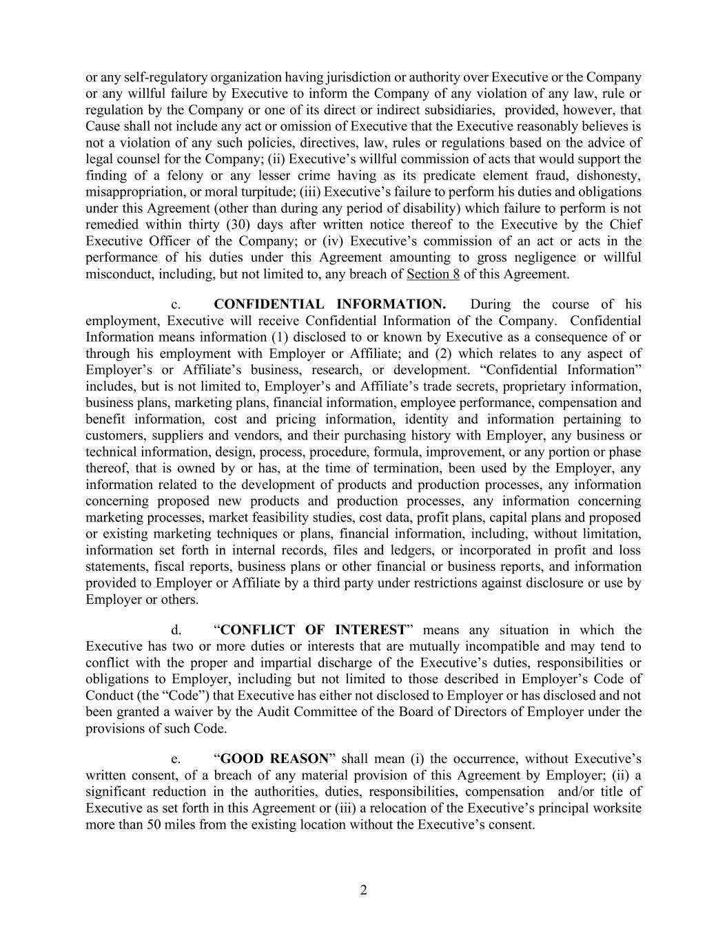 2 or any self-regulatory organization having jurisdiction or authority over Executive or the Company or any willful failure by Executive to inform the Company of any violation of any law, rule or regulation by the Company or one of its direct or indirect subsidiaries, provided, however, that Cause shall not include any act or omission of Executive that the Executive reasonably believes is not a violation of any such policies, directives, law, rules or regulations based on the advice of legal counsel for the Company; (ii) Executive’s willful commission of acts that would support the finding of a felony or any lesser crime having as its predicate element fraud, dishonesty, misappropriation, or moral turpitude; (iii) Executive’s failure to perform his duties and obligations under this Agreement (other than during any period of disability) which failure to perform is not remedied within thirty (30) days after written notice thereof to the Executive by the Chief Executive Officer of the Company; or (iv) Executive’s commission of an act or acts in the performance of his duties under this Agreement amounting to gross negligence or willful misconduct, including, but not limited to, any breach of Section 8 of this Agreement. c. CONFIDENTIAL INFORMATION. During the course of his employment, Executive will receive Confidential Information of the Company. Confidential Information means information (1) disclosed to or known by Executive as a consequence of or through his employment with Employer or Affiliate; and (2) which relates to any aspect of Employer’s or Affiliate’s business, research, or development. “Confidential Information” includes, but is not limited to, Employer’s and Affiliate’s trade secrets, proprietary information, business plans, marketing plans, financial information, employee performance, compensation and benefit information, cost and pricing information, identity and information pertaining to customers, suppliers and vendors, and their purchasing history with Employer, any business or technical information, design, process, procedure, formula, improvement, or any portion or phase thereof, that is owned by or has, at the time of termination, been used by the Employer, any information related to the development of products and production processes, any information concerning proposed new products and production processes, any information concerning marketing processes, market feasibility studies, cost data, profit plans, capital plans and proposed or existing marketing techniques or plans, financial information, including, without limitation, information set forth in internal records, files and ledgers, or incorporated in profit and loss statements, fiscal reports, business plans or other financial or business reports, and information provided to Employer or Affiliate by a third party under restrictions against disclosure or use by Employer or others. d. “CONFLICT OF INTEREST” means any situation in which the Executive has two or more duties or interests that are mutually incompatible and may tend to conflict with the proper and impartial discharge of the Executive’s duties, responsibilities or obligations to Employer, including but not limited to those described in Employer’s Code of Conduct (the “Code”) that Executive has either not disclosed to Employer or has disclosed and not been granted a waiver by the Audit Committee of the Board of Directors of Employer under the provisions of such Code. e. “GOOD REASON” shall mean (i) the occurrence, without Executive’s written consent, of a breach of any material provision of this Agreement by Employer; (ii) a significant reduction in the authorities, duties, responsibilities, compensation and/or title of Executive as set forth in this Agreement or (iii) a relocation of the Executive’s principal worksite more than 50 miles from the existing location without the Executive’s consent.