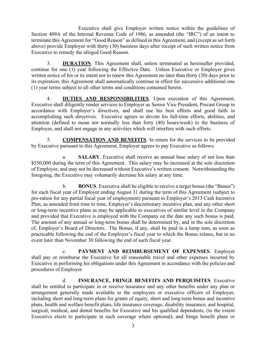 3 Executive shall give Employer written notice within the guidelines of Section 409A of the Internal Revenue Code of 1986, as amended (the “IRC”) of an intent to terminate this Agreement for “Good Reason” as defined in this Agreement, and (except as set forth above) provide Employer with thirty (30) business days after receipt of such written notice from Executive to remedy the alleged Good Reason. 3. DURATION. This Agreement shall, unless terminated as hereinafter provided, continue for one (1) year following the Effective Date. Unless Executive or Employer gives written notice of his or its intent not to renew this Agreement no later than thirty (30) days prior to its expiration, this Agreement shall automatically continue in effect for successive additional one (1) year terms subject to all other terms and conditions contained herein. 4. DUTIES AND RESPONSIBILITIES. Upon execution of this Agreement, Executive shall diligently render services to Employer as Senior Vice President, Precast Group in accordance with Employer’s directives, and shall use his best efforts and good faith in accomplishing such directives. Executive agrees to devote his full-time efforts, abilities, and attention (defined to mean not normally less than forty (40) hours/week) to the business of Employer, and shall not engage in any activities which will interfere with such efforts. 5. COMPENSATION AND BENEFITS. In return for the services to be provided by Executive pursuant to this Agreement, Employer agrees to pay Executive as follows: a. SALARY. Executive shall receive an annual base salary of not less than $550,000 during the term of this Agreement. This salary may be increased at the sole discretion of Employer, and may not be decreased without Executive’s written consent. Notwithstanding the foregoing, the Executive may voluntarily decrease his salary at any time. b. BONUS. Executive shall be eligible to receive a target bonus (the “Bonus”) for each fiscal year of Employer ending August 31 during the term of this Agreement (subject to pro-ration for any partial fiscal year of employment) pursuant to Employer’s 2013 Cash Incentive Plan, as amended from time to time, Employer’s discretionary incentive plan, and any other short or long-term incentive plans as may be applicable to executives of similar level in the Company and provided that Executive is employed with the Company on the date any such bonus is paid. The amount of any annual or long-term bonus shall be determined by, and in the sole discretion of, Employer’s Board of Directors. The Bonus, if any, shall be paid in a lump sum, as soon as practicable following the end of the Employer’s fiscal year to which the Bonus relates, but in no event later than November 30 following the end of such fiscal year. c. PAYMENT AND REIMBURSEMENT OF EXPENSES. Employer shall pay or reimburse the Executive for all reasonable travel and other expenses incurred by Executive in performing his obligations under this Agreement in accordance with the policies and procedures of Employer. d. INSURANCE, FRINGE BENEFITS AND PERQUISITES. Executive shall be entitled to participate in or receive insurance and any other benefits under any plan or arrangement generally made available to the employees or executive officers of Employer, including short and long-term plans for grants of equity, short and long-term bonus and incentive plans, health and welfare benefit plans, life insurance coverage, disability insurance, and hospital, surgical, medical, and dental benefits for Executive and his qualified dependents, (to the extent Executive elects to participate in such coverage where optional), and fringe benefit plans or