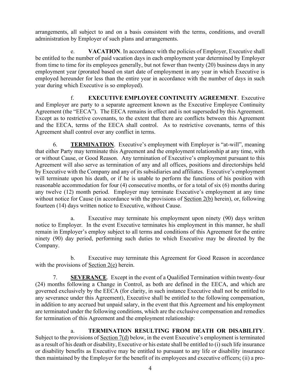 4 arrangements, all subject to and on a basis consistent with the terms, conditions, and overall administration by Employer of such plans and arrangements. e. VACATION. In accordance with the policies of Employer, Executive shall be entitled to the number of paid vacation days in each employment year determined by Employer from time to time for its employees generally, but not fewer than twenty (20) business days in any employment year (prorated based on start date of employment in any year in which Executive is employed hereunder for less than the entire year in accordance with the number of days in such year during which Executive is so employed). f. EXECUTIVE EMPLOYEE CONTINUITY AGREEMENT. Executive and Employer are party to a separate agreement known as the Executive Employee Continuity Agreement (the “EECA”). The EECA remains in effect and is not superseded by this Agreement. Except as to restrictive covenants, to the extent that there are conflicts between this Agreement and the EECA, terms of the EECA shall control. As to restrictive covenants, terms of this Agreement shall control over any conflict in terms. 6. TERMINATION. Executive’s employment with Employer is “at-will”, meaning that either Party may terminate this Agreement and the employment relationship at any time, with or without Cause, or Good Reason. Any termination of Executive’s employment pursuant to this Agreement will also serve as termination of any and all offices, positions and directorships held by Executive with the Company and any of its subsidiaries and affiliates. Executive’s employment will terminate upon his death, or if he is unable to perform the functions of his position with reasonable accommodation for four (4) consecutive months, or for a total of six (6) months during any twelve (12) month period. Employer may terminate Executive’s employment at any time without notice for Cause (in accordance with the provisions of Section 2(b) herein), or, following fourteen (14) days written notice to Executive, without Cause. a. Executive may terminate his employment upon ninety (90) days written notice to Employer. In the event Executive terminates his employment in this manner, he shall remain in Employer’s employ subject to all terms and conditions of this Agreement for the entire ninety (90) day period, performing such duties to which Executive may be directed by the Company. b. Executive may terminate this Agreement for Good Reason in accordance with the provisions of Section 2(e) herein. 7. SEVERANCE. Except in the event of a Qualified Termination within twenty-four (24) months following a Change in Control, as both are defined in the EECA, and which are governed exclusively by the EECA (for clarity, in such instance Executive shall not be entitled to any severance under this Agreement), Executive shall be entitled to the following compensation, in addition to any accrued but unpaid salary, in the event that this Agreement and his employment are terminated under the following conditions, which are the exclusive compensation and remedies for termination of this Agreement and the employment relationship: a. TERMINATION RESULTING FROM DEATH OR DISABILITY. Subject to the provisions of Section 7(d) below, in the event Executive’s employment is terminated as a result of his death or disability, Executive or his estate shall be entitled to (i) such life insurance or disability benefits as Executive may be entitled to pursuant to any life or disability insurance then maintained by the Employer for the benefit of its employees and executive officers; (ii) a pro-