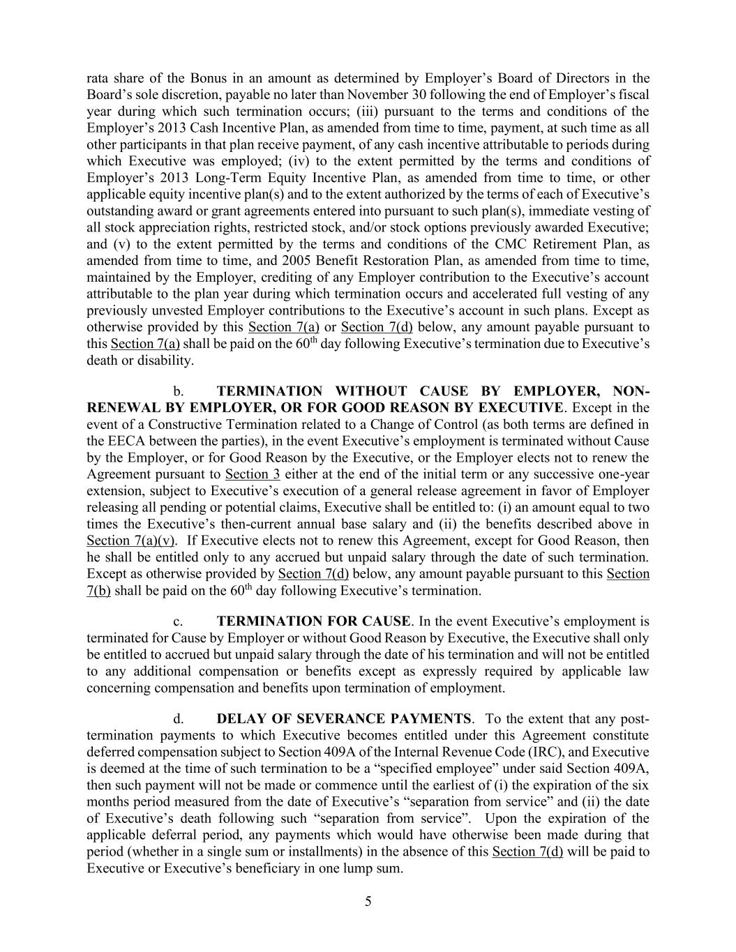 5 rata share of the Bonus in an amount as determined by Employer’s Board of Directors in the Board’s sole discretion, payable no later than November 30 following the end of Employer’s fiscal year during which such termination occurs; (iii) pursuant to the terms and conditions of the Employer’s 2013 Cash Incentive Plan, as amended from time to time, payment, at such time as all other participants in that plan receive payment, of any cash incentive attributable to periods during which Executive was employed; (iv) to the extent permitted by the terms and conditions of Employer’s 2013 Long-Term Equity Incentive Plan, as amended from time to time, or other applicable equity incentive plan(s) and to the extent authorized by the terms of each of Executive’s outstanding award or grant agreements entered into pursuant to such plan(s), immediate vesting of all stock appreciation rights, restricted stock, and/or stock options previously awarded Executive; and (v) to the extent permitted by the terms and conditions of the CMC Retirement Plan, as amended from time to time, and 2005 Benefit Restoration Plan, as amended from time to time, maintained by the Employer, crediting of any Employer contribution to the Executive’s account attributable to the plan year during which termination occurs and accelerated full vesting of any previously unvested Employer contributions to the Executive’s account in such plans. Except as otherwise provided by this Section 7(a) or Section 7(d) below, any amount payable pursuant to this Section 7(a) shall be paid on the 60th day following Executive’s termination due to Executive’s death or disability. b. TERMINATION WITHOUT CAUSE BY EMPLOYER, NON- RENEWAL BY EMPLOYER, OR FOR GOOD REASON BY EXECUTIVE. Except in the event of a Constructive Termination related to a Change of Control (as both terms are defined in the EECA between the parties), in the event Executive’s employment is terminated without Cause by the Employer, or for Good Reason by the Executive, or the Employer elects not to renew the Agreement pursuant to Section 3 either at the end of the initial term or any successive one-year extension, subject to Executive’s execution of a general release agreement in favor of Employer releasing all pending or potential claims, Executive shall be entitled to: (i) an amount equal to two times the Executive’s then-current annual base salary and (ii) the benefits described above in Section 7(a)(v). If Executive elects not to renew this Agreement, except for Good Reason, then he shall be entitled only to any accrued but unpaid salary through the date of such termination. Except as otherwise provided by Section 7(d) below, any amount payable pursuant to this Section 7(b) shall be paid on the 60th day following Executive’s termination. c. TERMINATION FOR CAUSE. In the event Executive’s employment is terminated for Cause by Employer or without Good Reason by Executive, the Executive shall only be entitled to accrued but unpaid salary through the date of his termination and will not be entitled to any additional compensation or benefits except as expressly required by applicable law concerning compensation and benefits upon termination of employment. d. DELAY OF SEVERANCE PAYMENTS. To the extent that any post- termination payments to which Executive becomes entitled under this Agreement constitute deferred compensation subject to Section 409A of the Internal Revenue Code (IRC), and Executive is deemed at the time of such termination to be a “specified employee” under said Section 409A, then such payment will not be made or commence until the earliest of (i) the expiration of the six months period measured from the date of Executive’s “separation from service” and (ii) the date of Executive’s death following such “separation from service”. Upon the expiration of the applicable deferral period, any payments which would have otherwise been made during that period (whether in a single sum or installments) in the absence of this Section 7(d) will be paid to Executive or Executive’s beneficiary in one lump sum.