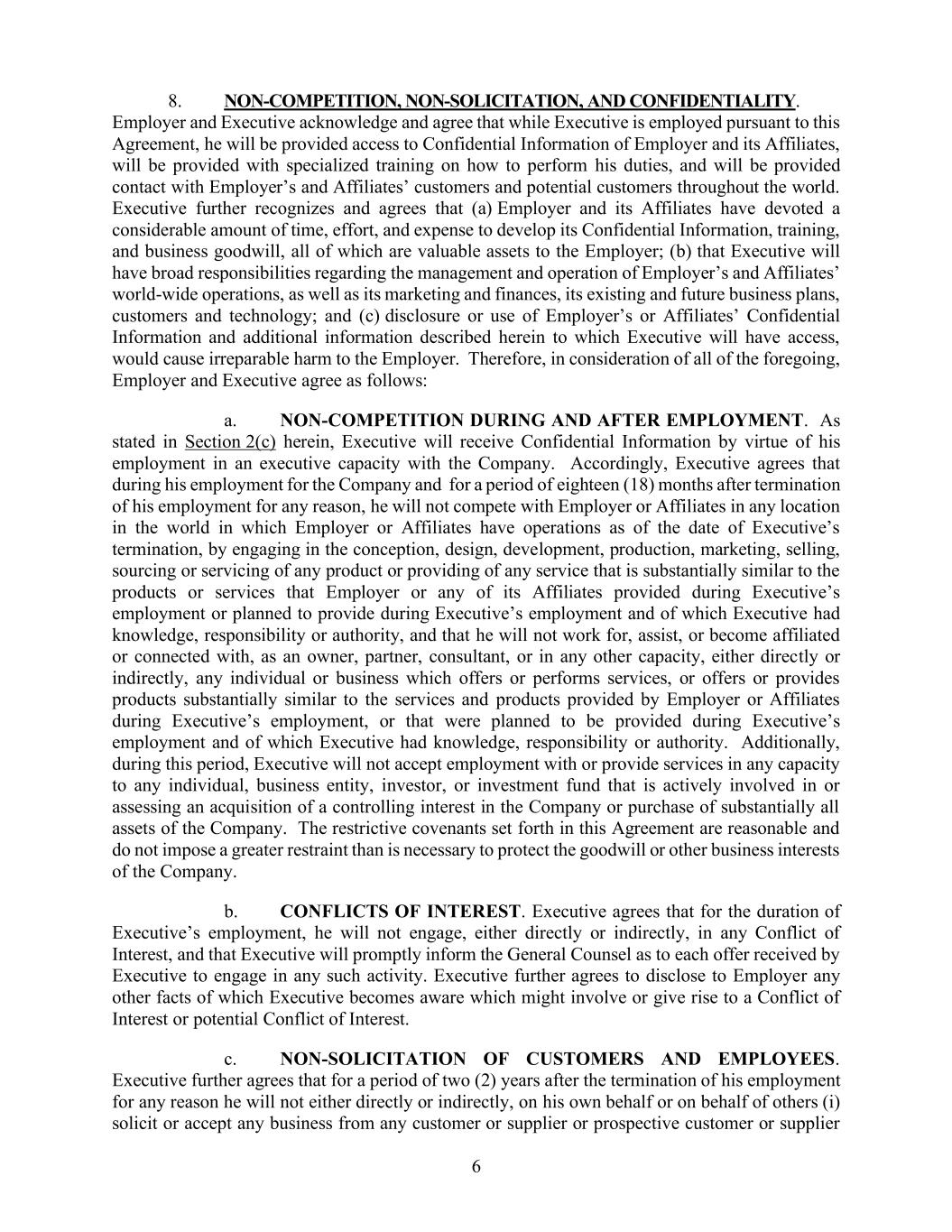 6 8. NON-COMPETITION, NON-SOLICITATION, AND CONFIDENTIALITY. Employer and Executive acknowledge and agree that while Executive is employed pursuant to this Agreement, he will be provided access to Confidential Information of Employer and its Affiliates, will be provided with specialized training on how to perform his duties, and will be provided contact with Employer’s and Affiliates’ customers and potential customers throughout the world. Executive further recognizes and agrees that (a) Employer and its Affiliates have devoted a considerable amount of time, effort, and expense to develop its Confidential Information, training, and business goodwill, all of which are valuable assets to the Employer; (b) that Executive will have broad responsibilities regarding the management and operation of Employer’s and Affiliates’ world-wide operations, as well as its marketing and finances, its existing and future business plans, customers and technology; and (c) disclosure or use of Employer’s or Affiliates’ Confidential Information and additional information described herein to which Executive will have access, would cause irreparable harm to the Employer. Therefore, in consideration of all of the foregoing, Employer and Executive agree as follows: a. NON-COMPETITION DURING AND AFTER EMPLOYMENT. As stated in Section 2(c) herein, Executive will receive Confidential Information by virtue of his employment in an executive capacity with the Company. Accordingly, Executive agrees that during his employment for the Company and for a period of eighteen (18) months after termination of his employment for any reason, he will not compete with Employer or Affiliates in any location in the world in which Employer or Affiliates have operations as of the date of Executive’s termination, by engaging in the conception, design, development, production, marketing, selling, sourcing or servicing of any product or providing of any service that is substantially similar to the products or services that Employer or any of its Affiliates provided during Executive’s employment or planned to provide during Executive’s employment and of which Executive had knowledge, responsibility or authority, and that he will not work for, assist, or become affiliated or connected with, as an owner, partner, consultant, or in any other capacity, either directly or indirectly, any individual or business which offers or performs services, or offers or provides products substantially similar to the services and products provided by Employer or Affiliates during Executive’s employment, or that were planned to be provided during Executive’s employment and of which Executive had knowledge, responsibility or authority. Additionally, during this period, Executive will not accept employment with or provide services in any capacity to any individual, business entity, investor, or investment fund that is actively involved in or assessing an acquisition of a controlling interest in the Company or purchase of substantially all assets of the Company. The restrictive covenants set forth in this Agreement are reasonable and do not impose a greater restraint than is necessary to protect the goodwill or other business interests of the Company. b. CONFLICTS OF INTEREST. Executive agrees that for the duration of Executive’s employment, he will not engage, either directly or indirectly, in any Conflict of Interest, and that Executive will promptly inform the General Counsel as to each offer received by Executive to engage in any such activity. Executive further agrees to disclose to Employer any other facts of which Executive becomes aware which might involve or give rise to a Conflict of Interest or potential Conflict of Interest. c. NON-SOLICITATION OF CUSTOMERS AND EMPLOYEES. Executive further agrees that for a period of two (2) years after the termination of his employment for any reason he will not either directly or indirectly, on his own behalf or on behalf of others (i) solicit or accept any business from any customer or supplier or prospective customer or supplier