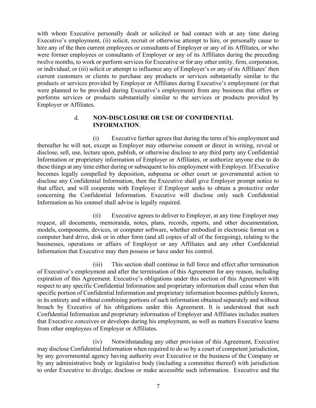 7 with whom Executive personally dealt or solicited or had contact with at any time during Executive’s employment, (ii) solicit, recruit or otherwise attempt to hire, or personally cause to hire any of the then current employees or consultants of Employer or any of its Affiliates, or who were former employees or consultants of Employer or any of its Affiliates during the preceding twelve months, to work or perform services for Executive or for any other entity, firm, corporation, or individual; or (iii) solicit or attempt to influence any of Employer’s or any of its Affiliates’ then current customers or clients to purchase any products or services substantially similar to the products or services provided by Employer or Affiliates during Executive’s employment (or that were planned to be provided during Executive’s employment) from any business that offers or performs services or products substantially similar to the services or products provided by Employer or Affiliates. d. NON-DISCLOSURE OR USE OF CONFIDENTIAL INFORMATION. (i) Executive further agrees that during the term of his employment and thereafter he will not, except as Employer may otherwise consent or direct in writing, reveal or disclose, sell, use, lecture upon, publish, or otherwise disclose to any third party any Confidential Information or proprietary information of Employer or Affiliates, or authorize anyone else to do these things at any time either during or subsequent to his employment with Employer. If Executive becomes legally compelled by deposition, subpoena or other court or governmental action to disclose any Confidential Information, then the Executive shall give Employer prompt notice to that effect, and will cooperate with Employer if Employer seeks to obtain a protective order concerning the Confidential Information. Executive will disclose only such Confidential Information as his counsel shall advise is legally required. (ii) Executive agrees to deliver to Employer, at any time Employer may request, all documents, memoranda, notes, plans, records, reports, and other documentation, models, components, devices, or computer software, whether embodied in electronic format on a computer hard drive, disk or in other form (and all copies of all of the foregoing), relating to the businesses, operations or affairs of Employer or any Affiliates and any other Confidential Information that Executive may then possess or have under his control. (iii) This section shall continue in full force and effect after termination of Executive’s employment and after the termination of this Agreement for any reason, including expiration of this Agreement. Executive’s obligations under this section of this Agreement with respect to any specific Confidential Information and proprietary information shall cease when that specific portion of Confidential Information and proprietary information becomes publicly known, in its entirety and without combining portions of such information obtained separately and without breach by Executive of his obligations under this Agreement. It is understood that such Confidential Information and proprietary information of Employer and Affiliates includes matters that Executive conceives or develops during his employment, as well as matters Executive learns from other employees of Employer or Affiliates. (iv) Notwithstanding any other provision of this Agreement, Executive may disclose Confidential Information when required to do so by a court of competent jurisdiction, by any governmental agency having authority over Executive or the business of the Company or by any administrative body or legislative body (including a committee thereof) with jurisdiction to order Executive to divulge, disclose or make accessible such information. Executive and the