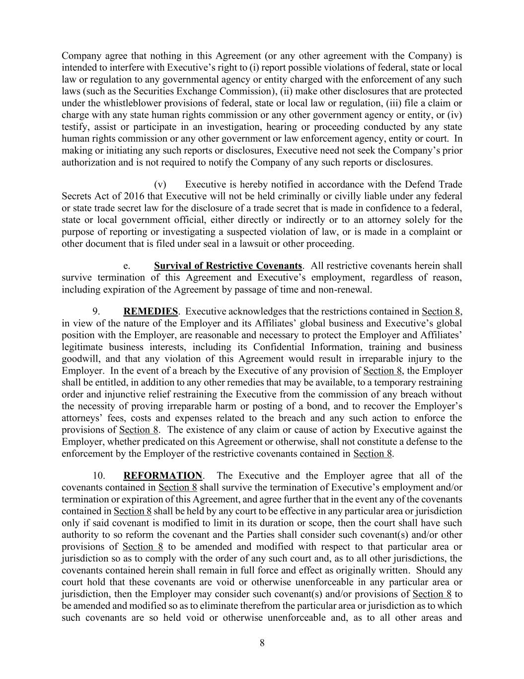 8 Company agree that nothing in this Agreement (or any other agreement with the Company) is intended to interfere with Executive’s right to (i) report possible violations of federal, state or local law or regulation to any governmental agency or entity charged with the enforcement of any such laws (such as the Securities Exchange Commission), (ii) make other disclosures that are protected under the whistleblower provisions of federal, state or local law or regulation, (iii) file a claim or charge with any state human rights commission or any other government agency or entity, or (iv) testify, assist or participate in an investigation, hearing or proceeding conducted by any state human rights commission or any other government or law enforcement agency, entity or court. In making or initiating any such reports or disclosures, Executive need not seek the Company’s prior authorization and is not required to notify the Company of any such reports or disclosures. (v) Executive is hereby notified in accordance with the Defend Trade Secrets Act of 2016 that Executive will not be held criminally or civilly liable under any federal or state trade secret law for the disclosure of a trade secret that is made in confidence to a federal, state or local government official, either directly or indirectly or to an attorney solely for the purpose of reporting or investigating a suspected violation of law, or is made in a complaint or other document that is filed under seal in a lawsuit or other proceeding. e. Survival of Restrictive Covenants. All restrictive covenants herein shall survive termination of this Agreement and Executive’s employment, regardless of reason, including expiration of the Agreement by passage of time and non-renewal. 9. REMEDIES. Executive acknowledges that the restrictions contained in Section 8, in view of the nature of the Employer and its Affiliates’ global business and Executive’s global position with the Employer, are reasonable and necessary to protect the Employer and Affiliates’ legitimate business interests, including its Confidential Information, training and business goodwill, and that any violation of this Agreement would result in irreparable injury to the Employer. In the event of a breach by the Executive of any provision of Section 8, the Employer shall be entitled, in addition to any other remedies that may be available, to a temporary restraining order and injunctive relief restraining the Executive from the commission of any breach without the necessity of proving irreparable harm or posting of a bond, and to recover the Employer’s attorneys’ fees, costs and expenses related to the breach and any such action to enforce the provisions of Section 8. The existence of any claim or cause of action by Executive against the Employer, whether predicated on this Agreement or otherwise, shall not constitute a defense to the enforcement by the Employer of the restrictive covenants contained in Section 8. 10. REFORMATION. The Executive and the Employer agree that all of the covenants contained in Section 8 shall survive the termination of Executive’s employment and/or termination or expiration of this Agreement, and agree further that in the event any of the covenants contained in Section 8 shall be held by any court to be effective in any particular area or jurisdiction only if said covenant is modified to limit in its duration or scope, then the court shall have such authority to so reform the covenant and the Parties shall consider such covenant(s) and/or other provisions of Section 8 to be amended and modified with respect to that particular area or jurisdiction so as to comply with the order of any such court and, as to all other jurisdictions, the covenants contained herein shall remain in full force and effect as originally written. Should any court hold that these covenants are void or otherwise unenforceable in any particular area or jurisdiction, then the Employer may consider such covenant(s) and/or provisions of Section 8 to be amended and modified so as to eliminate therefrom the particular area or jurisdiction as to which such covenants are so held void or otherwise unenforceable and, as to all other areas and