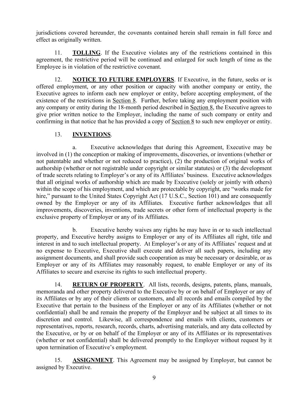 9 jurisdictions covered hereunder, the covenants contained herein shall remain in full force and effect as originally written. 11. TOLLING. If the Executive violates any of the restrictions contained in this agreement, the restrictive period will be continued and enlarged for such length of time as the Employee is in violation of the restrictive covenant. 12. NOTICE TO FUTURE EMPLOYERS. If Executive, in the future, seeks or is offered employment, or any other position or capacity with another company or entity, the Executive agrees to inform each new employer or entity, before accepting employment, of the existence of the restrictions in Section 8. Further, before taking any employment position with any company or entity during the 18-month period described in Section 8, the Executive agrees to give prior written notice to the Employer, including the name of such company or entity and confirming in that notice that he has provided a copy of Section 8 to such new employer or entity. 13. INVENTIONS. a. Executive acknowledges that during this Agreement, Executive may be involved in (1) the conception or making of improvements, discoveries, or inventions (whether or not patentable and whether or not reduced to practice), (2) the production of original works of authorship (whether or not registrable under copyright or similar statutes) or (3) the development of trade secrets relating to Employer’s or any of its Affiliates’ business. Executive acknowledges that all original works of authorship which are made by Executive (solely or jointly with others) within the scope of his employment, and which are protectable by copyright, are “works made for hire,” pursuant to the United States Copyright Act (17 U.S.C., Section 101) and are consequently owned by the Employer or any of its Affiliates. Executive further acknowledges that all improvements, discoveries, inventions, trade secrets or other form of intellectual property is the exclusive property of Employer or any of its Affiliates. b. Executive hereby waives any rights he may have in or to such intellectual property, and Executive hereby assigns to Employer or any of its Affiliates all right, title and interest in and to such intellectual property. At Employer’s or any of its Affiliates’ request and at no expense to Executive, Executive shall execute and deliver all such papers, including any assignment documents, and shall provide such cooperation as may be necessary or desirable, or as Employer or any of its Affiliates may reasonably request, to enable Employer or any of its Affiliates to secure and exercise its rights to such intellectual property. 14. RETURN OF PROPERTY. All lists, records, designs, patents, plans, manuals, memoranda and other property delivered to the Executive by or on behalf of Employer or any of its Affiliates or by any of their clients or customers, and all records and emails compiled by the Executive that pertain to the business of the Employer or any of its Affiliates (whether or not confidential) shall be and remain the property of the Employer and be subject at all times to its discretion and control. Likewise, all correspondence and emails with clients, customers or representatives, reports, research, records, charts, advertising materials, and any data collected by the Executive, or by or on behalf of the Employer or any of its Affiliates or its representatives (whether or not confidential) shall be delivered promptly to the Employer without request by it upon termination of Executive’s employment. 15. ASSIGNMENT. This Agreement may be assigned by Employer, but cannot be assigned by Executive.