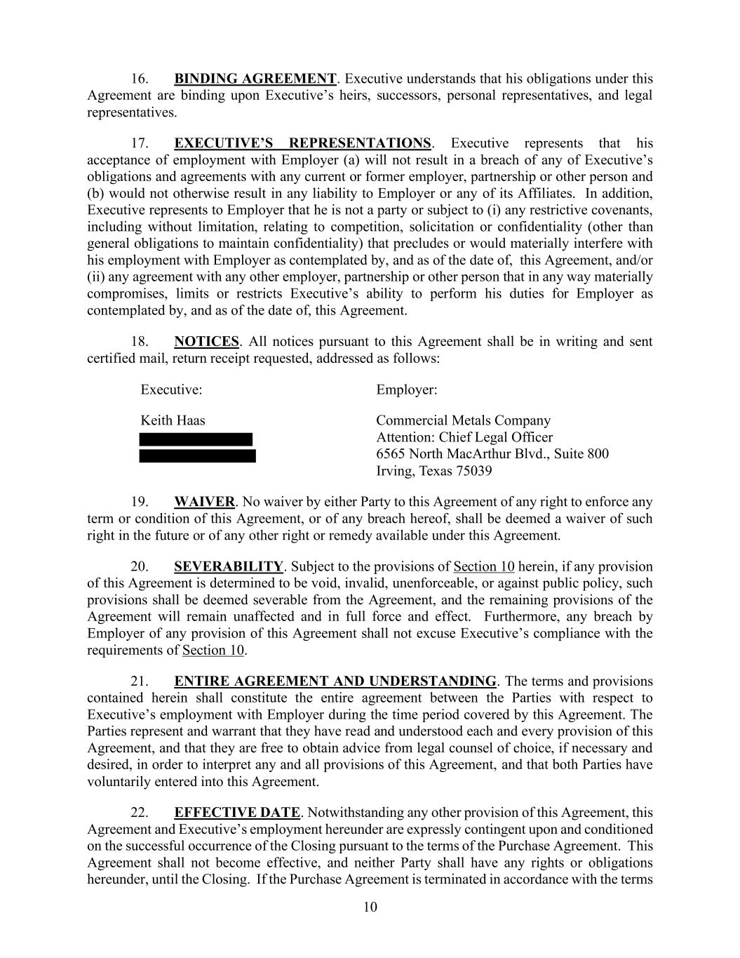 10 16. BINDING AGREEMENT. Executive understands that his obligations under this Agreement are binding upon Executive’s heirs, successors, personal representatives, and legal representatives. 17. EXECUTIVE’S REPRESENTATIONS. Executive represents that his acceptance of employment with Employer (a) will not result in a breach of any of Executive’s obligations and agreements with any current or former employer, partnership or other person and (b) would not otherwise result in any liability to Employer or any of its Affiliates. In addition, Executive represents to Employer that he is not a party or subject to (i) any restrictive covenants, including without limitation, relating to competition, solicitation or confidentiality (other than general obligations to maintain confidentiality) that precludes or would materially interfere with his employment with Employer as contemplated by, and as of the date of, this Agreement, and/or (ii) any agreement with any other employer, partnership or other person that in any way materially compromises, limits or restricts Executive’s ability to perform his duties for Employer as contemplated by, and as of the date of, this Agreement. 18. NOTICES. All notices pursuant to this Agreement shall be in writing and sent certified mail, return receipt requested, addressed as follows: Executive: Employer: Keith Haas Commercial Metals Company Attention: Chief Legal Officer 6565 North MacArthur Blvd., Suite 800 Irving, Texas 75039 19. WAIVER. No waiver by either Party to this Agreement of any right to enforce any term or condition of this Agreement, or of any breach hereof, shall be deemed a waiver of such right in the future or of any other right or remedy available under this Agreement. 20. SEVERABILITY. Subject to the provisions of Section 10 herein, if any provision of this Agreement is determined to be void, invalid, unenforceable, or against public policy, such provisions shall be deemed severable from the Agreement, and the remaining provisions of the Agreement will remain unaffected and in full force and effect. Furthermore, any breach by Employer of any provision of this Agreement shall not excuse Executive’s compliance with the requirements of Section 10. 21. ENTIRE AGREEMENT AND UNDERSTANDING. The terms and provisions contained herein shall constitute the entire agreement between the Parties with respect to Executive’s employment with Employer during the time period covered by this Agreement. The Parties represent and warrant that they have read and understood each and every provision of this Agreement, and that they are free to obtain advice from legal counsel of choice, if necessary and desired, in order to interpret any and all provisions of this Agreement, and that both Parties have voluntarily entered into this Agreement. 22. EFFECTIVE DATE. Notwithstanding any other provision of this Agreement, this Agreement and Executive’s employment hereunder are expressly contingent upon and conditioned on the successful occurrence of the Closing pursuant to the terms of the Purchase Agreement. This Agreement shall not become effective, and neither Party shall have any rights or obligations hereunder, until the Closing. If the Purchase Agreement is terminated in accordance with the terms