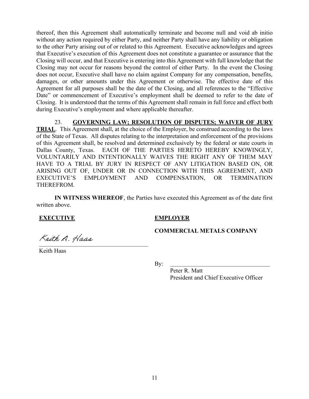11 thereof, then this Agreement shall automatically terminate and become null and void ab initio without any action required by either Party, and neither Party shall have any liability or obligation to the other Party arising out of or related to this Agreement. Executive acknowledges and agrees that Executive’s execution of this Agreement does not constitute a guarantee or assurance that the Closing will occur, and that Executive is entering into this Agreement with full knowledge that the Closing may not occur for reasons beyond the control of either Party. In the event the Closing does not occur, Executive shall have no claim against Company for any compensation, benefits, damages, or other amounts under this Agreement or otherwise. The effective date of this Agreement for all purposes shall be the date of the Closing, and all references to the “Effective Date” or commencement of Executive’s employment shall be deemed to refer to the date of Closing. It is understood that the terms of this Agreement shall remain in full force and effect both during Executive’s employment and where applicable thereafter. 23. GOVERNING LAW; RESOLUTION OF DISPUTES; WAIVER OF JURY TRIAL. This Agreement shall, at the choice of the Employer, be construed according to the laws of the State of Texas. All disputes relating to the interpretation and enforcement of the provisions of this Agreement shall, be resolved and determined exclusively by the federal or state courts in Dallas County, Texas. EACH OF THE PARTIES HERETO HEREBY KNOWINGLY, VOLUNTARILY AND INTENTIONALLY WAIVES THE RIGHT ANY OF THEM MAY HAVE TO A TRIAL BY JURY IN RESPECT OF ANY LITIGATION BASED ON, OR ARISING OUT OF, UNDER OR IN CONNECTION WITH THIS AGREEMENT, AND EXECUTIVE’S EMPLOYMENT AND COMPENSATION, OR TERMINATION THEREFROM. IN WITNESS WHEREOF, the Parties have executed this Agreement as of the date first written above. EXECUTIVE EMPLOYER COMMERCIAL METALS COMPANY Keith Haas By: Peter R. Matt President and Chief Executive Officer