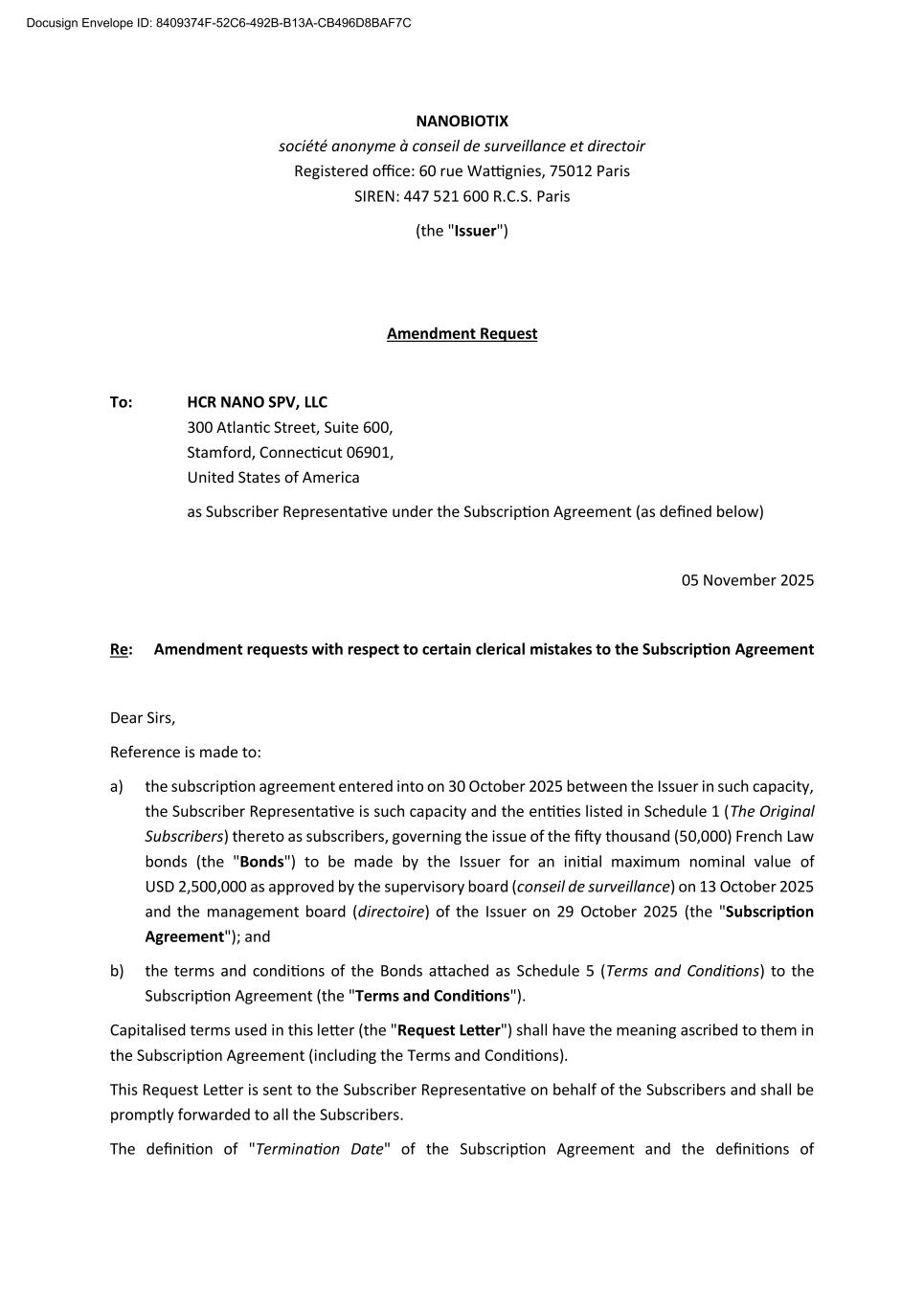 NANOBIOTIX société anonyme à conseil de surveillance et directoir Registered office: 60 rue Wattignies, 75012 Paris SIREN: 447 521 600 R.C.S. Paris (the "Issuer") Amendment Request To: HCR NANO SPV, LLC 300 Atlantic Street, Suite 600, Stamford, Connecticut 06901, United States of America as Subscriber Representative under the Subscription Agreement (as defined below) 05 November 2025 Re: Amendment requests with respect to certain clerical mistakes to the Subscription Agreement Dear Sirs, Reference is made to: a) the subscription agreement entered into on 30 October 2025 between the Issuer in such capacity, the Subscriber Representative is such capacity and the entities listed in Schedule 1 (The Original Subscribers) thereto as subscribers, governing the issue of the fifty thousand (50,000) French Law bonds (the "Bonds") to be made by the Issuer for an initial maximum nominal value of USD 2,500,000 as approved by the supervisory board (conseil de surveillance) on 13 October 2025 and the management board (directoire) of the Issuer on 29 October 2025 (the "Subscription Agreement"); and b) the terms and conditions of the Bonds attached as Schedule 5 (Terms and Conditions) to the Subscription Agreement (the "Terms and Conditions"). Capitalised terms used in this letter (the "Request Letter") shall have the meaning ascribed to them in the Subscription Agreement (including the Terms and Conditions). This Request Letter is sent to the Subscriber Representative on behalf of the Subscribers and shall be promptly forwarded to all the Subscribers. The definition of "Termination Date" of the Subscription Agreement and the definitions of Docusign Envelope ID: 8409374F-52C6-492B-B13A-CB496D8BAF7C