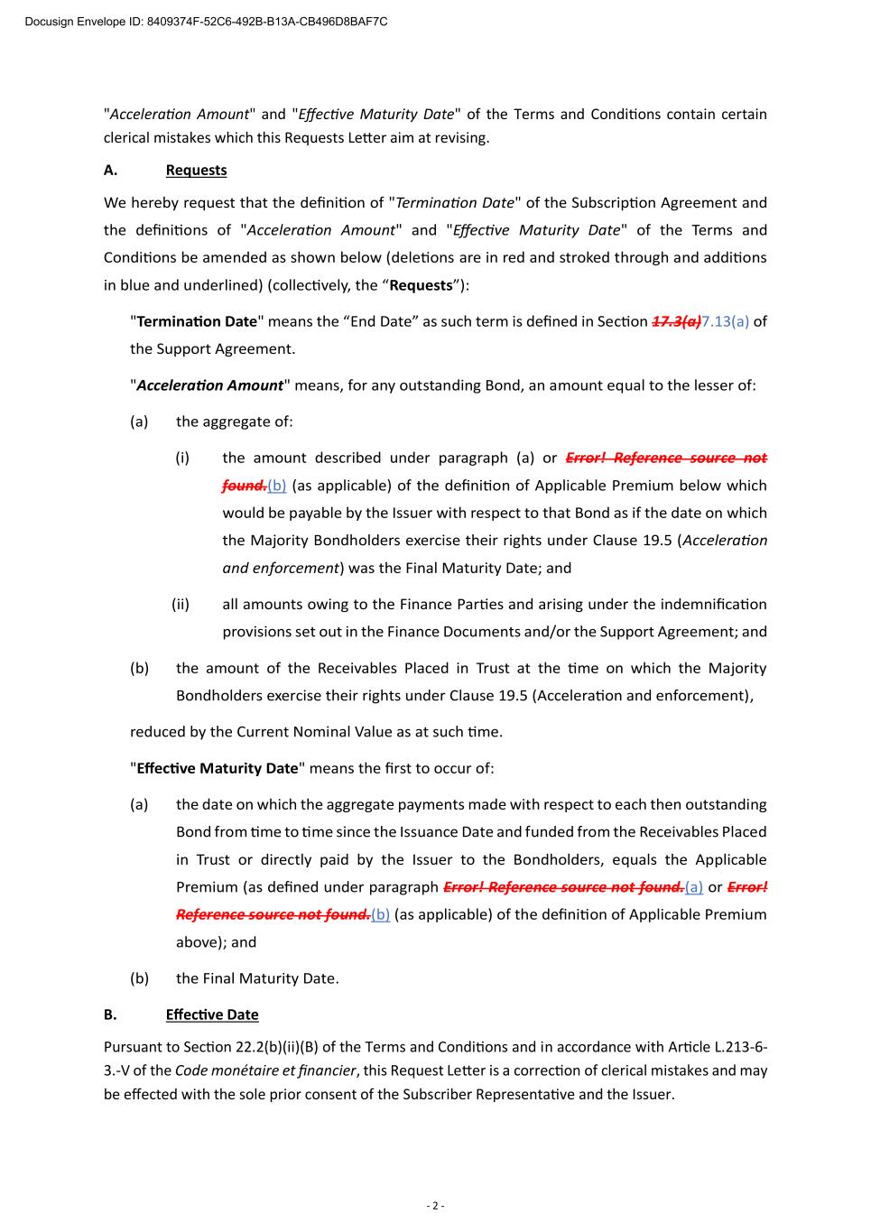 - 2 - "Acceleration Amount" and "Effective Maturity Date" of the Terms and Conditions contain certain clerical mistakes which this Requests Letter aim at revising. A. Requests We hereby request that the definition of "Termination Date" of the Subscription Agreement and the definitions of "Acceleration Amount" and "Effective Maturity Date" of the Terms and Conditions be amended as shown below (deletions are in red and stroked through and additions in blue and underlined) (collectively, the “Requests”): "Termination Date" means the “End Date” as such term is defined in Section 17.3(a)7.13(a) of the Support Agreement. "Acceleration Amount" means, for any outstanding Bond, an amount equal to the lesser of: (a) the aggregate of: (i) the amount described under paragraph (a) or Error! Reference source not found.(b) (as applicable) of the definition of Applicable Premium below which would be payable by the Issuer with respect to that Bond as if the date on which the Majority Bondholders exercise their rights under Clause 19.5 (Acceleration and enforcement) was the Final Maturity Date; and (ii) all amounts owing to the Finance Parties and arising under the indemnification provisions set out in the Finance Documents and/or the Support Agreement; and (b) the amount of the Receivables Placed in Trust at the time on which the Majority Bondholders exercise their rights under Clause 19.5 (Acceleration and enforcement), reduced by the Current Nominal Value as at such time. "Effective Maturity Date" means the first to occur of: (a) the date on which the aggregate payments made with respect to each then outstanding Bond from time to time since the Issuance Date and funded from the Receivables Placed in Trust or directly paid by the Issuer to the Bondholders, equals the Applicable Premium (as defined under paragraph Error! Reference source not found.(a) or Error! Reference source not found.(b) (as applicable) of the definition of Applicable Premium above); and (b) the Final Maturity Date. B. Effective Date Pursuant to Section 22.2(b)(ii)(B) of the Terms and Conditions and in accordance with Article L.213-6- 3.-V of the Code monétaire et financier, this Request Letter is a correction of clerical mistakes and may be effected with the sole prior consent of the Subscriber Representative and the Issuer. Docusign Envelope ID: 8409374F-52C6-492B-B13A-CB496D8BAF7C