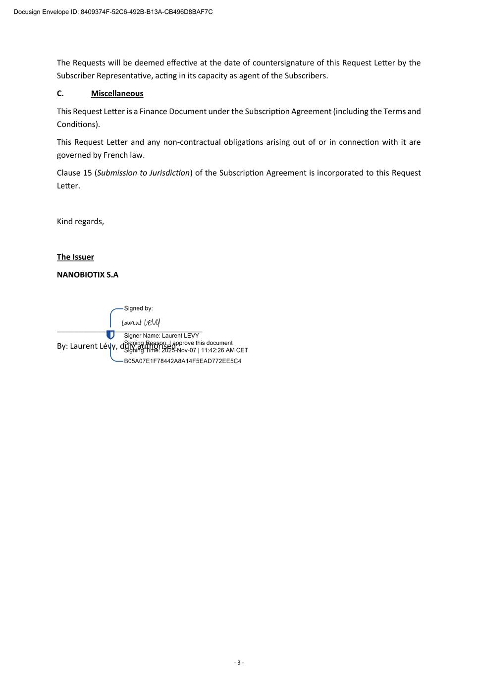 - 3 - The Requests will be deemed effective at the date of countersignature of this Request Letter by the Subscriber Representative, acting in its capacity as agent of the Subscribers. C. Miscellaneous This Request Letter is a Finance Document under the Subscription Agreement (including the Terms and Conditions). This Request Letter and any non-contractual obligations arising out of or in connection with it are governed by French law. Clause 15 (Submission to Jurisdiction) of the Subscription Agreement is incorporated to this Request Letter. Kind regards, The Issuer NANOBIOTIX S.A _________________________________ By: Laurent Lévy, duly authorised Docusign Envelope ID: 8409374F-52C6-492B-B13A-CB496D8BAF7C