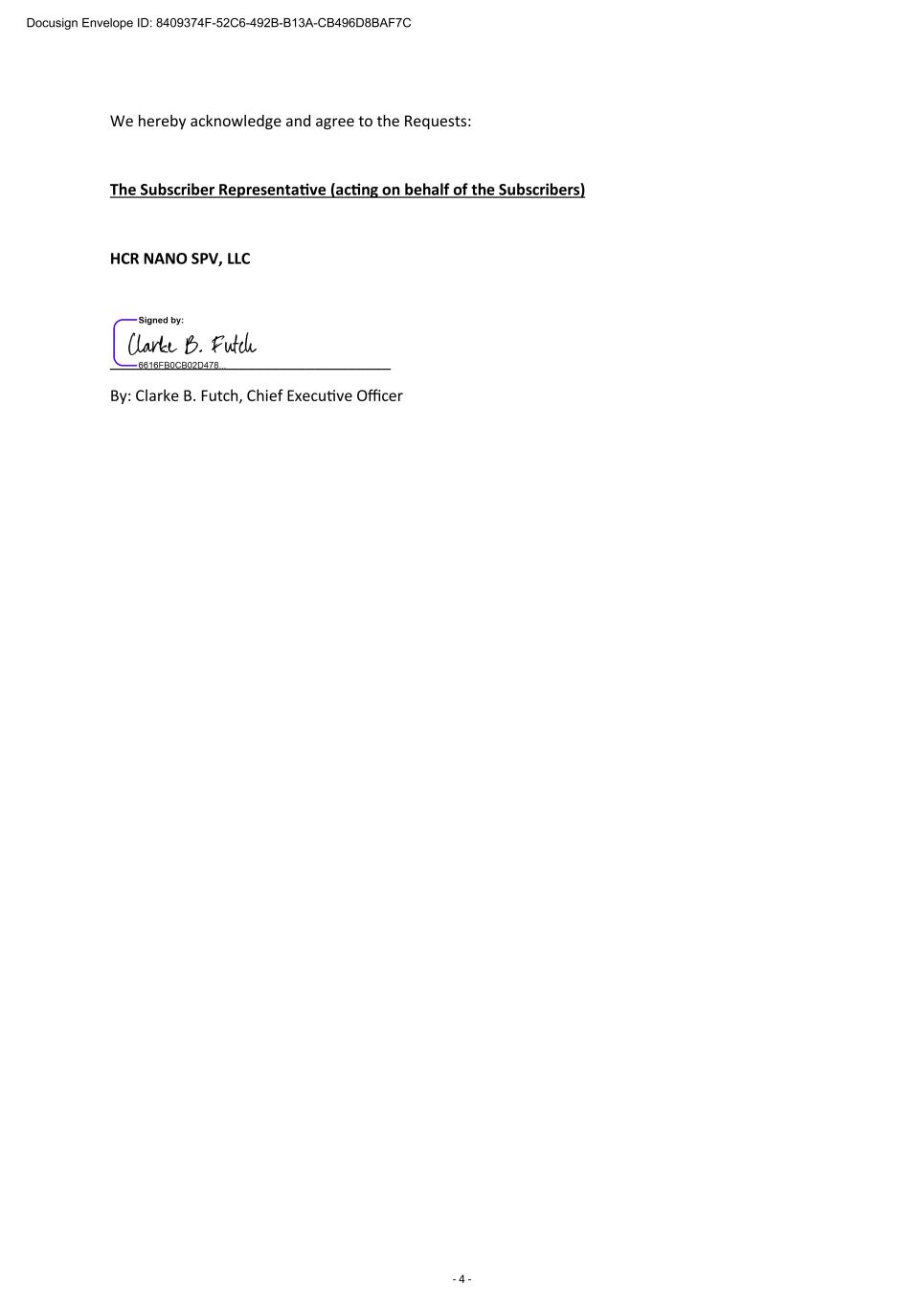 - 4 - We hereby acknowledge and agree to the Requests: The Subscriber Representative (acting on behalf of the Subscribers) HCR NANO SPV, LLC _________________________________ By: Clarke B. Futch, Chief Executive Officer Docusign Envelope ID: 8409374F-52C6-492B-B13A-CB496D8BAF7C