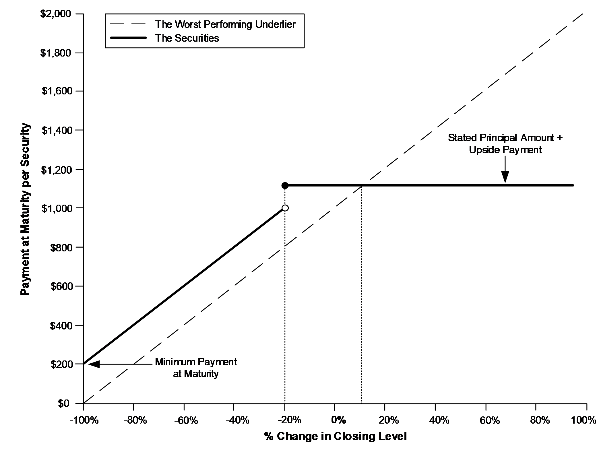 •If the final level of each underlier is greater than or equal to its buffer level: stated principal amount + upside payment •If the final level of any underlier is less than its buffer level: stated principal amount × (performance factor of the worst performing underlier + buffer amount) Under these circumstances, the payment at maturity will be less, and may be significantly less, than the stated principal amount, subject to the minimum payment at maturity. |