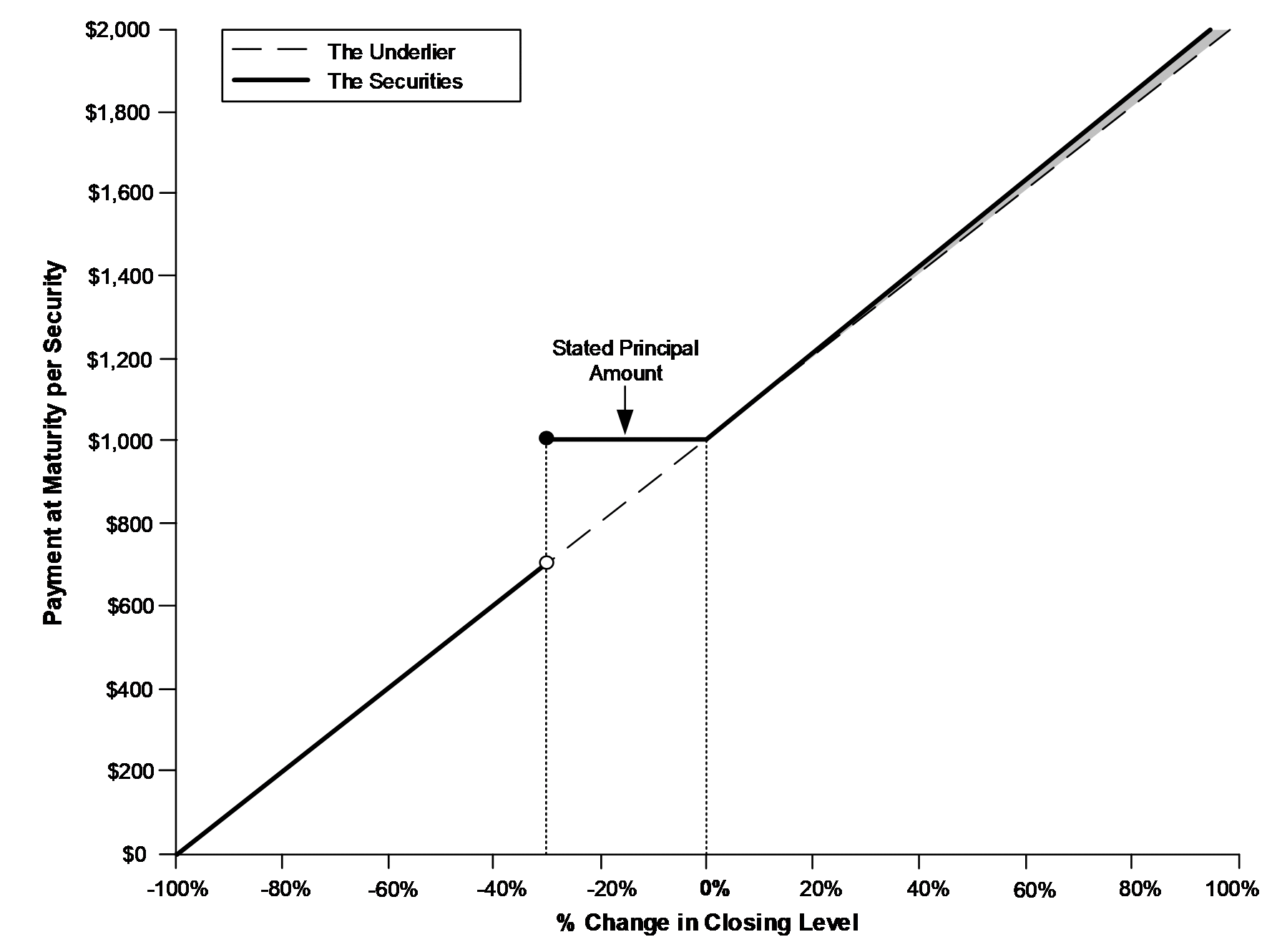 ■Downside Scenario. If the final level is less than the downside threshold level, investors will receive an amount that is significantly less than the stated principal amount, based on a 1% loss of principal for every 1% decline in the level of the underlier. There is no minimum payment at maturity, and investors could lose their entire initial investment in the securities.