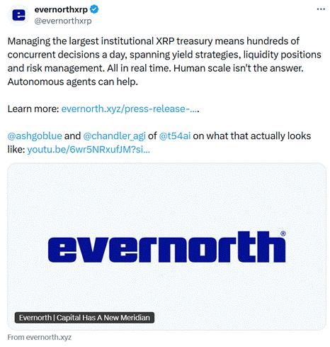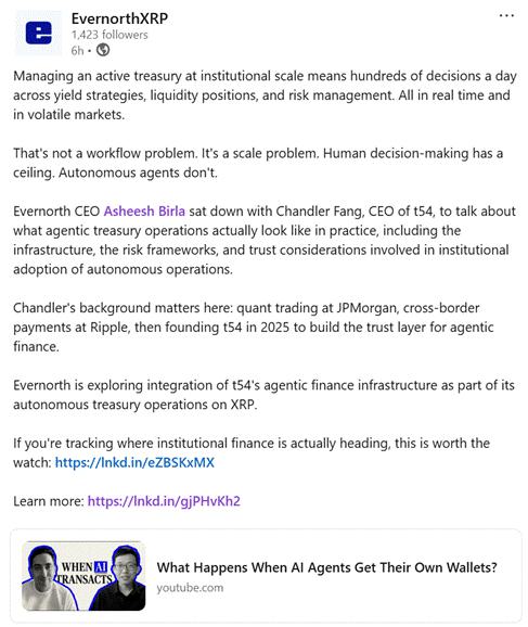 | Asheesh Birla | Hello everybody, I am Asheesh Birla and I am the CEO of Evernorth. And today I'm joined with a long time friend and former Ripple colleague Chandler Fang. We'll get to have him introduce himself in a second. But Evernorth is building the largest institutional XRP treasury out there. And in running it means that we're making hundreds of treasury decisions per day and maybe in the future that even accelerates. Why? Because crypto moves so frictionlessly and there's so much opportunity out there, which makes me question, is there a new way that we treasurers and treasury companies and the traditional corporate treasurer should be thinking about managing their treasury operations in the context of AI? And the reality is that a lot of treasury companies like Evernorth - we're actively managing our treasury versus passive management of treasury. That means that we're actually going to put that treasury to work into different kinds of yield operations across traditional means and also on chain using the XRP Ledger. The question is, can humans manage all that risk appropriately as the scale and speed of crypto comes into play, especially with decentralized finance or DeFi. So I brought in Chandler because Chandler is an awesome guy. One of the smartest people I've ever had the pleasure of working with. He's the founder of an exciting company called t54. Chandler, I think you're the perfect person to answer some of the questions that I just asked that I think that treasury companies like Evernorth and corporate treasurers are going to face in this convergence of crypto and AI. Chandler, why don't you take it away and give a quick intro.
