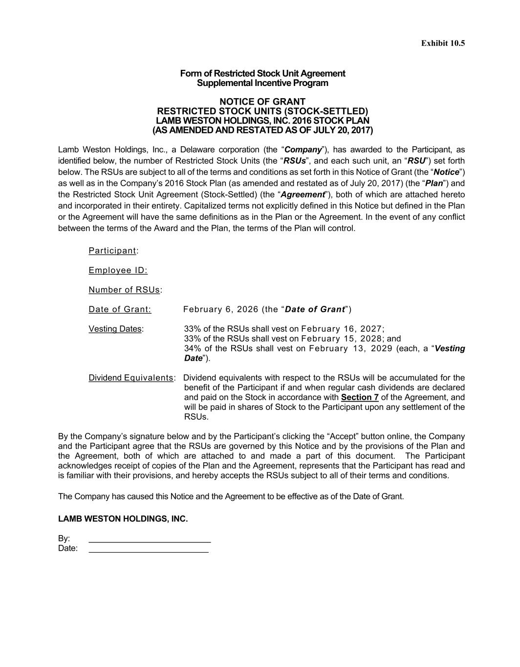 Exhibit 10.5 Form of Restricted Stock Unit Agreement Supplemental Incentive Program NOTICE OF GRANT RESTRICTED STOCK UNITS (STOCK-SETTLED) LAMB WESTON HOLDINGS, INC. 2016 STOCK PLAN (AS AMENDED AND RESTATED AS OF JULY 20, 2017) Lamb Weston Holdings, Inc., a Delaware corporation (the “Company”), has awarded to the Participant, as identified below, the number of Restricted Stock Units (the “RSUs”, and each such unit, an “RSU”) set forth below. The RSUs are subject to all of the terms and conditions as set forth in this Notice of Grant (the “Notice”) as well as in the Company’s 2016 Stock Plan (as amended and restated as of July 20, 2017) (the “Plan”) and the Restricted Stock Unit Agreement (Stock-Settled) (the “Agreement”), both of which are attached hereto and incorporated in their entirety. Capitalized terms not explicitly defined in this Notice but defined in the Plan or the Agreement will have the same definitions as in the Plan or the Agreement. In the event of any conflict between the terms of the Award and the Plan, the terms of the Plan will control. Participant: Employee ID: Number of RSUs: Date of Grant: February 6, 2026 (the “Date of Grant”) Vesting Dates: 33% of the RSUs shall vest on February 16, 2027; 33% of the RSUs shall vest on February 15, 2028; and 34% of the RSUs shall vest on February 13, 2029 (each, a “Vesting Date”). Dividend Equivalents: Dividend equivalents with respect to the RSUs will be accumulated for the benefit of the Participant if and when regular cash dividends are declared and paid on the Stock in accordance with Section 7 of the Agreement, and will be paid in shares of Stock to the Participant upon any settlement of the RSUs. By the Company’s signature below and by the Participant’s clicking the “Accept” button online, the Company and the Participant agree that the RSUs are governed by this Notice and by the provisions of the Plan and the Agreement, both of which are attached to and made a part of this document. The Participant acknowledges receipt of copies of the Plan and the Agreement, represents that the Participant has read and is familiar with their provisions, and hereby accepts the RSUs subject to all of their terms and conditions. The Company has caused this Notice and the Agreement to be effective as of the Date of Grant. LAMB WESTON HOLDINGS, INC. By: Date: __________________________