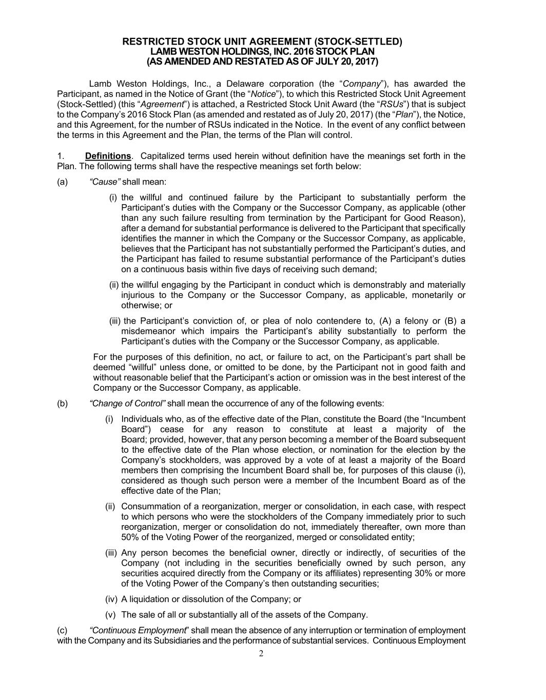 2 RESTRICTED STOCK UNIT AGREEMENT (STOCK-SETTLED) LAMB WESTON HOLDINGS, INC. 2016 STOCK PLAN (AS AMENDED AND RESTATED AS OF JULY 20, 2017) Lamb Weston Holdings, Inc., a Delaware corporation (the “Company”), has awarded the Participant, as named in the Notice of Grant (the “Notice”), to which this Restricted Stock Unit Agreement (Stock-Settled) (this “Agreement”) is attached, a Restricted Stock Unit Award (the “RSUs”) that is subject to the Company’s 2016 Stock Plan (as amended and restated as of July 20, 2017) (the “Plan”), the Notice, and this Agreement, for the number of RSUs indicated in the Notice. In the event of any conflict between the terms in this Agreement and the Plan, the terms of the Plan will control. 1. Definitions. Capitalized terms used herein without definition have the meanings set forth in the Plan. The following terms shall have the respective meanings set forth below: (a) “Cause” shall mean: (i) the willful and continued failure by the Participant to substantially perform the Participant’s duties with the Company or the Successor Company, as applicable (other than any such failure resulting from termination by the Participant for Good Reason), after a demand for substantial performance is delivered to the Participant that specifically identifies the manner in which the Company or the Successor Company, as applicable, believes that the Participant has not substantially performed the Participant’s duties, and the Participant has failed to resume substantial performance of the Participant’s duties on a continuous basis within five days of receiving such demand; (ii) the willful engaging by the Participant in conduct which is demonstrably and materially injurious to the Company or the Successor Company, as applicable, monetarily or otherwise; or (iii) the Participant’s conviction of, or plea of nolo contendere to, (A) a felony or (B) a misdemeanor which impairs the Participant’s ability substantially to perform the Participant’s duties with the Company or the Successor Company, as applicable. For the purposes of this definition, no act, or failure to act, on the Participant’s part shall be deemed “willful” unless done, or omitted to be done, by the Participant not in good faith and without reasonable belief that the Participant’s action or omission was in the best interest of the Company or the Successor Company, as applicable. (b) “Change of Control” shall mean the occurrence of any of the following events: (i) Individuals who, as of the effective date of the Plan, constitute the Board (the “Incumbent Board”) cease for any reason to constitute at least a majority of the Board; provided, however, that any person becoming a member of the Board subsequent to the effective date of the Plan whose election, or nomination for the election by the Company’s stockholders, was approved by a vote of at least a majority of the Board members then comprising the Incumbent Board shall be, for purposes of this clause (i), considered as though such person were a member of the Incumbent Board as of the effective date of the Plan; (ii) Consummation of a reorganization, merger or consolidation, in each case, with respect to which persons who were the stockholders of the Company immediately prior to such reorganization, merger or consolidation do not, immediately thereafter, own more than 50% of the Voting Power of the reorganized, merged or consolidated entity; (iii) Any person becomes the beneficial owner, directly or indirectly, of securities of the Company (not including in the securities beneficially owned by such person, any securities acquired directly from the Company or its affiliates) representing 30% or more of the Voting Power of the Company’s then outstanding securities; (iv) A liquidation or dissolution of the Company; or (v) The sale of all or substantially all of the assets of the Company. (c) “Continuous Employment” shall mean the absence of any interruption or termination of employment with the Company and its Subsidiaries and the performance of substantial services. Continuous Employment