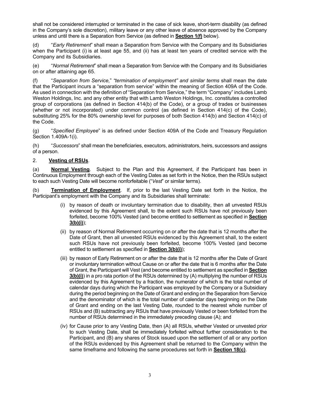 3 shall not be considered interrupted or terminated in the case of sick leave, short-term disability (as defined in the Company’s sole discretion), military leave or any other leave of absence approved by the Company unless and until there is a Separation from Service (as defined in Section 1(f) below). (d) “Early Retirement” shall mean a Separation from Service with the Company and its Subsidiaries when the Participant (i) is at least age 55, and (ii) has at least ten years of credited service with the Company and its Subsidiaries. (e) “Normal Retirement” shall mean a Separation from Service with the Company and its Subsidiaries on or after attaining age 65. (f) “Separation from Service,” “termination of employment” and similar terms shall mean the date that the Participant incurs a “separation from service” within the meaning of Section 409A of the Code. As used in connection with the definition of “Separation from Service,” the term “Company” includes Lamb Weston Holdings, Inc. and any other entity that with Lamb Weston Holdings, Inc. constitutes a controlled group of corporations (as defined in Section 414(b) of the Code), or a group of trades or businesses (whether or not incorporated) under common control (as defined in Section 414(c) of the Code), substituting 25% for the 80% ownership level for purposes of both Section 414(b) and Section 414(c) of the Code. (g) “Specified Employee” is as defined under Section 409A of the Code and Treasury Regulation Section 1.409A-1(i). (h) “Successors” shall mean the beneficiaries, executors, administrators, heirs, successors and assigns of a person. 2. Vesting of RSUs. (a) Normal Vesting. Subject to the Plan and this Agreement, if the Participant has been in Continuous Employment through each of the Vesting Dates as set forth in the Notice, then the RSUs subject to each such Vesting Date will become nonforfeitable (“Vest” or similar terms). (b) Termination of Employment. If, prior to the last Vesting Date set forth in the Notice, the Participant’s employment with the Company and its Subsidiaries shall terminate: (i) by reason of death or involuntary termination due to disability, then all unvested RSUs evidenced by this Agreement shall, to the extent such RSUs have not previously been forfeited, become 100% Vested (and become entitled to settlement as specified in Section 3(b)(i)); (ii) by reason of Normal Retirement occurring on or after the date that is 12 months after the Date of Grant, then all unvested RSUs evidenced by this Agreement shall, to the extent such RSUs have not previously been forfeited, become 100% Vested (and become entitled to settlement as specified in Section 3(b)(i)); (iii) by reason of Early Retirement on or after the date that is 12 months after the Date of Grant or involuntary termination without Cause on or after the date that is 6 months after the Date of Grant, the Participant will Vest (and become entitled to settlement as specified in Section 3(b)(i)) in a pro rata portion of the RSUs determined by (A) multiplying the number of RSUs evidenced by this Agreement by a fraction, the numerator of which is the total number of calendar days during which the Participant was employed by the Company or a Subsidiary during the period beginning on the Date of Grant and ending on the Separation from Service and the denominator of which is the total number of calendar days beginning on the Date of Grant and ending on the last Vesting Date, rounded to the nearest whole number of RSUs and (B) subtracting any RSUs that have previously Vested or been forfeited from the number of RSUs determined in the immediately preceding clause (A); and (iv) for Cause prior to any Vesting Date, then (A) all RSUs, whether Vested or unvested prior to such Vesting Date, shall be immediately forfeited without further consideration to the Participant, and (B) any shares of Stock issued upon the settlement of all or any portion of the RSUs evidenced by this Agreement shall be returned to the Company within the same timeframe and following the same procedures set forth in Section 18(c).
