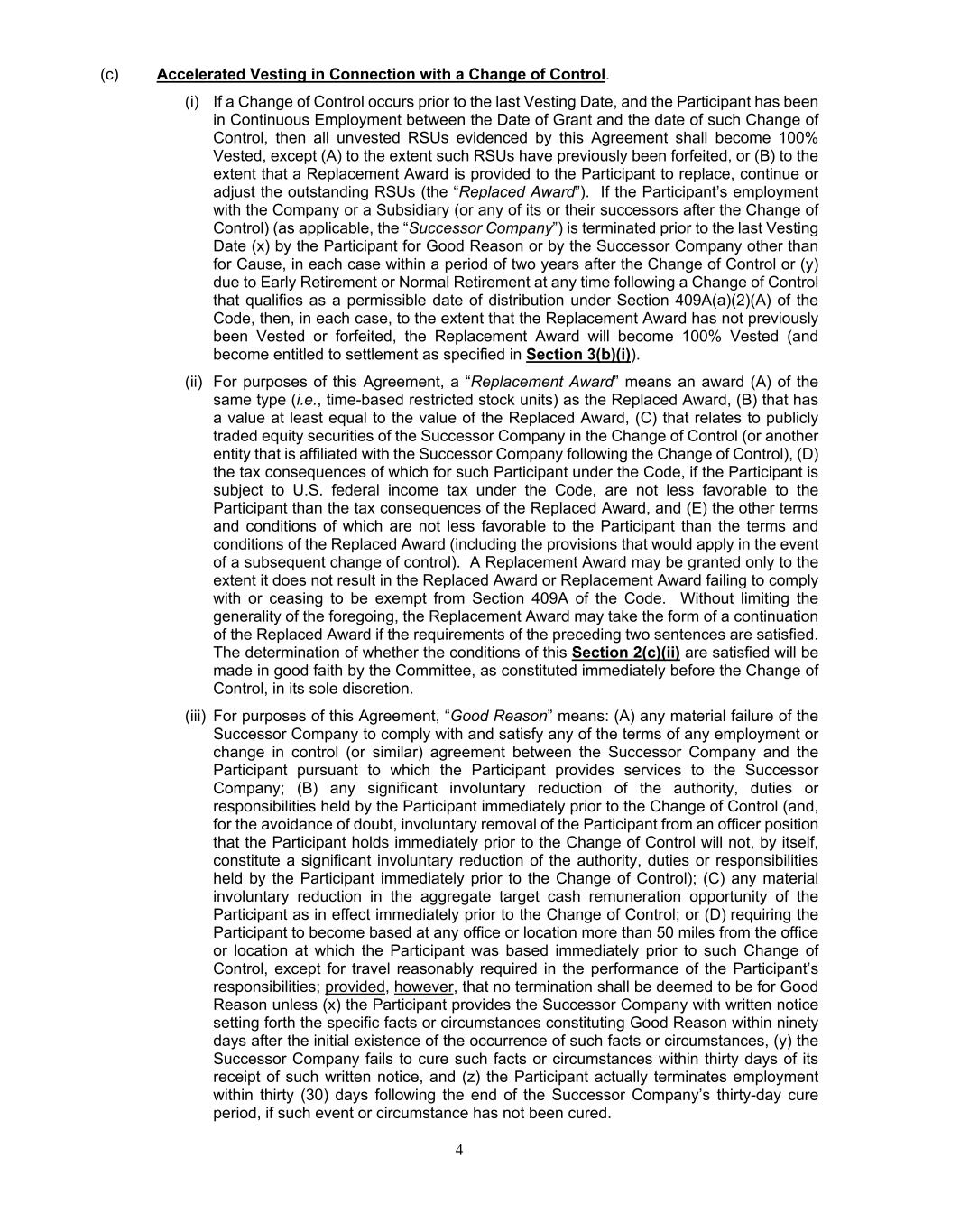 4 (c) Accelerated Vesting in Connection with a Change of Control. (i) If a Change of Control occurs prior to the last Vesting Date, and the Participant has been in Continuous Employment between the Date of Grant and the date of such Change of Control, then all unvested RSUs evidenced by this Agreement shall become 100% Vested, except (A) to the extent such RSUs have previously been forfeited, or (B) to the extent that a Replacement Award is provided to the Participant to replace, continue or adjust the outstanding RSUs (the “Replaced Award”). If the Participant’s employment with the Company or a Subsidiary (or any of its or their successors after the Change of Control) (as applicable, the “Successor Company”) is terminated prior to the last Vesting Date (x) by the Participant for Good Reason or by the Successor Company other than for Cause, in each case within a period of two years after the Change of Control or (y) due to Early Retirement or Normal Retirement at any time following a Change of Control that qualifies as a permissible date of distribution under Section 409A(a)(2)(A) of the Code, then, in each case, to the extent that the Replacement Award has not previously been Vested or forfeited, the Replacement Award will become 100% Vested (and become entitled to settlement as specified in Section 3(b)(i)). (ii) For purposes of this Agreement, a “Replacement Award” means an award (A) of the same type (i.e., time-based restricted stock units) as the Replaced Award, (B) that has a value at least equal to the value of the Replaced Award, (C) that relates to publicly traded equity securities of the Successor Company in the Change of Control (or another entity that is affiliated with the Successor Company following the Change of Control), (D) the tax consequences of which for such Participant under the Code, if the Participant is subject to U.S. federal income tax under the Code, are not less favorable to the Participant than the tax consequences of the Replaced Award, and (E) the other terms and conditions of which are not less favorable to the Participant than the terms and conditions of the Replaced Award (including the provisions that would apply in the event of a subsequent change of control). A Replacement Award may be granted only to the extent it does not result in the Replaced Award or Replacement Award failing to comply with or ceasing to be exempt from Section 409A of the Code. Without limiting the generality of the foregoing, the Replacement Award may take the form of a continuation of the Replaced Award if the requirements of the preceding two sentences are satisfied. The determination of whether the conditions of this Section 2(c)(ii) are satisfied will be made in good faith by the Committee, as constituted immediately before the Change of Control, in its sole discretion. (iii) For purposes of this Agreement, “Good Reason” means: (A) any material failure of the Successor Company to comply with and satisfy any of the terms of any employment or change in control (or similar) agreement between the Successor Company and the Participant pursuant to which the Participant provides services to the Successor Company; (B) any significant involuntary reduction of the authority, duties or responsibilities held by the Participant immediately prior to the Change of Control (and, for the avoidance of doubt, involuntary removal of the Participant from an officer position that the Participant holds immediately prior to the Change of Control will not, by itself, constitute a significant involuntary reduction of the authority, duties or responsibilities held by the Participant immediately prior to the Change of Control); (C) any material involuntary reduction in the aggregate target cash remuneration opportunity of the Participant as in effect immediately prior to the Change of Control; or (D) requiring the Participant to become based at any office or location more than 50 miles from the office or location at which the Participant was based immediately prior to such Change of Control, except for travel reasonably required in the performance of the Participant’s responsibilities; provided, however, that no termination shall be deemed to be for Good Reason unless (x) the Participant provides the Successor Company with written notice setting forth the specific facts or circumstances constituting Good Reason within ninety days after the initial existence of the occurrence of such facts or circumstances, (y) the Successor Company fails to cure such facts or circumstances within thirty days of its receipt of such written notice, and (z) the Participant actually terminates employment within thirty (30) days following the end of the Successor Company’s thirty-day cure period, if such event or circumstance has not been cured.