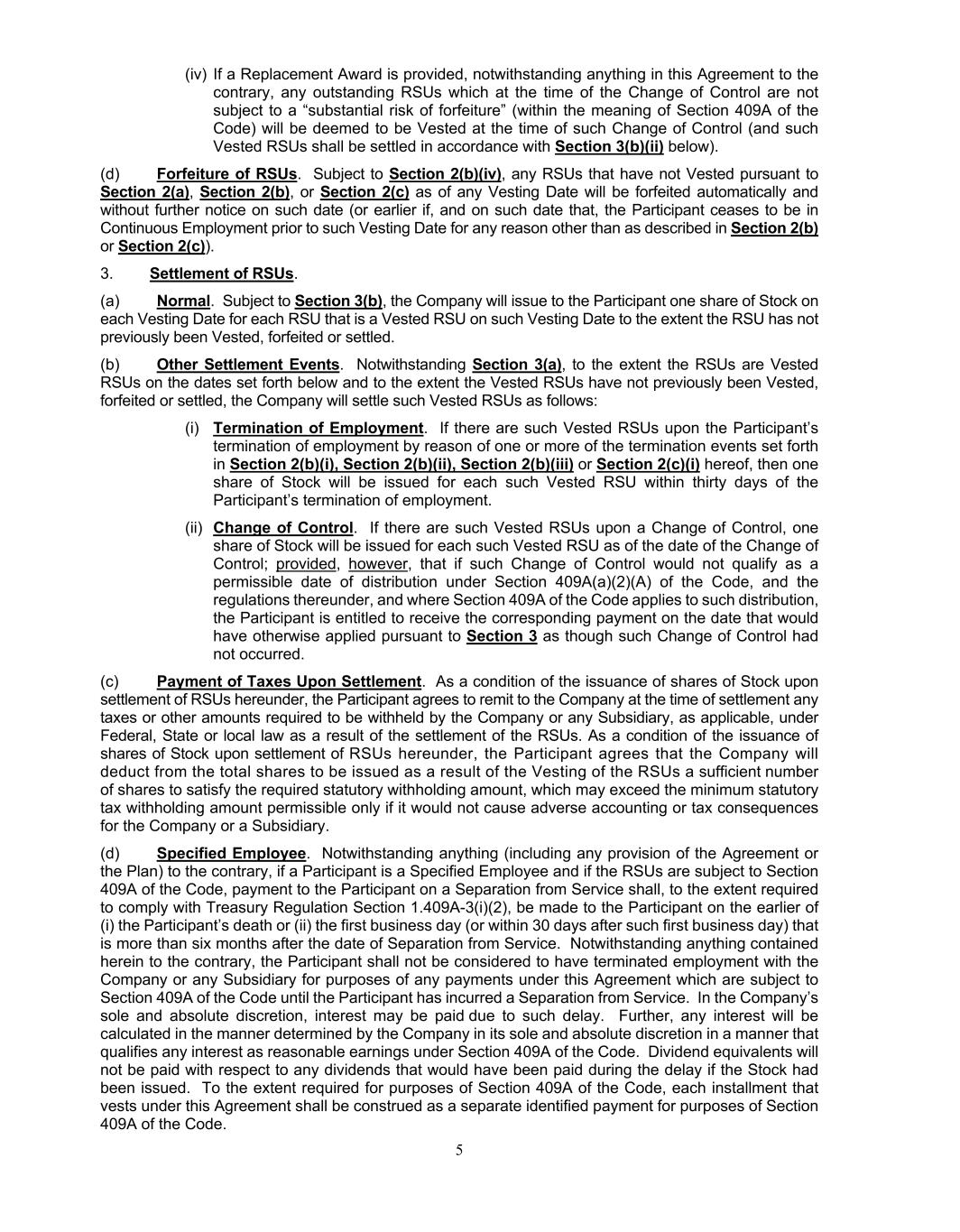 5 (iv) If a Replacement Award is provided, notwithstanding anything in this Agreement to the contrary, any outstanding RSUs which at the time of the Change of Control are not subject to a “substantial risk of forfeiture” (within the meaning of Section 409A of the Code) will be deemed to be Vested at the time of such Change of Control (and such Vested RSUs shall be settled in accordance with Section 3(b)(ii) below). (d) Forfeiture of RSUs. Subject to Section 2(b)(iv), any RSUs that have not Vested pursuant to Section 2(a), Section 2(b), or Section 2(c) as of any Vesting Date will be forfeited automatically and without further notice on such date (or earlier if, and on such date that, the Participant ceases to be in Continuous Employment prior to such Vesting Date for any reason other than as described in Section 2(b) or Section 2(c)). 3. Settlement of RSUs. (a) Normal. Subject to Section 3(b), the Company will issue to the Participant one share of Stock on each Vesting Date for each RSU that is a Vested RSU on such Vesting Date to the extent the RSU has not previously been Vested, forfeited or settled. (b) Other Settlement Events. Notwithstanding Section 3(a), to the extent the RSUs are Vested RSUs on the dates set forth below and to the extent the Vested RSUs have not previously been Vested, forfeited or settled, the Company will settle such Vested RSUs as follows: (i) Termination of Employment. If there are such Vested RSUs upon the Participant’s termination of employment by reason of one or more of the termination events set forth in Section 2(b)(i), Section 2(b)(ii), Section 2(b)(iii) or Section 2(c)(i) hereof, then one share of Stock will be issued for each such Vested RSU within thirty days of the Participant’s termination of employment. (ii) Change of Control. If there are such Vested RSUs upon a Change of Control, one share of Stock will be issued for each such Vested RSU as of the date of the Change of Control; provided, however, that if such Change of Control would not qualify as a permissible date of distribution under Section 409A(a)(2)(A) of the Code, and the regulations thereunder, and where Section 409A of the Code applies to such distribution, the Participant is entitled to receive the corresponding payment on the date that would have otherwise applied pursuant to Section 3 as though such Change of Control had not occurred. (c) Payment of Taxes Upon Settlement. As a condition of the issuance of shares of Stock upon settlement of RSUs hereunder, the Participant agrees to remit to the Company at the time of settlement any taxes or other amounts required to be withheld by the Company or any Subsidiary, as applicable, under Federal, State or local law as a result of the settlement of the RSUs. As a condition of the issuance of shares of Stock upon settlement of RSUs hereunder, the Participant agrees that the Company will deduct from the total shares to be issued as a result of the Vesting of the RSUs a sufficient number of shares to satisfy the required statutory withholding amount, which may exceed the minimum statutory tax withholding amount permissible only if it would not cause adverse accounting or tax consequences for the Company or a Subsidiary. (d) Specified Employee. Notwithstanding anything (including any provision of the Agreement or the Plan) to the contrary, if a Participant is a Specified Employee and if the RSUs are subject to Section 409A of the Code, payment to the Participant on a Separation from Service shall, to the extent required to comply with Treasury Regulation Section 1.409A-3(i)(2), be made to the Participant on the earlier of (i) the Participant’s death or (ii) the first business day (or within 30 days after such first business day) that is more than six months after the date of Separation from Service. Notwithstanding anything contained herein to the contrary, the Participant shall not be considered to have terminated employment with the Company or any Subsidiary for purposes of any payments under this Agreement which are subject to Section 409A of the Code until the Participant has incurred a Separation from Service. In the Company’s sole and absolute discretion, interest may be paid due to such delay. Further, any interest will be calculated in the manner determined by the Company in its sole and absolute discretion in a manner that qualifies any interest as reasonable earnings under Section 409A of the Code. Dividend equivalents will not be paid with respect to any dividends that would have been paid during the delay if the Stock had been issued. To the extent required for purposes of Section 409A of the Code, each installment that vests under this Agreement shall be construed as a separate identified payment for purposes of Section 409A of the Code.