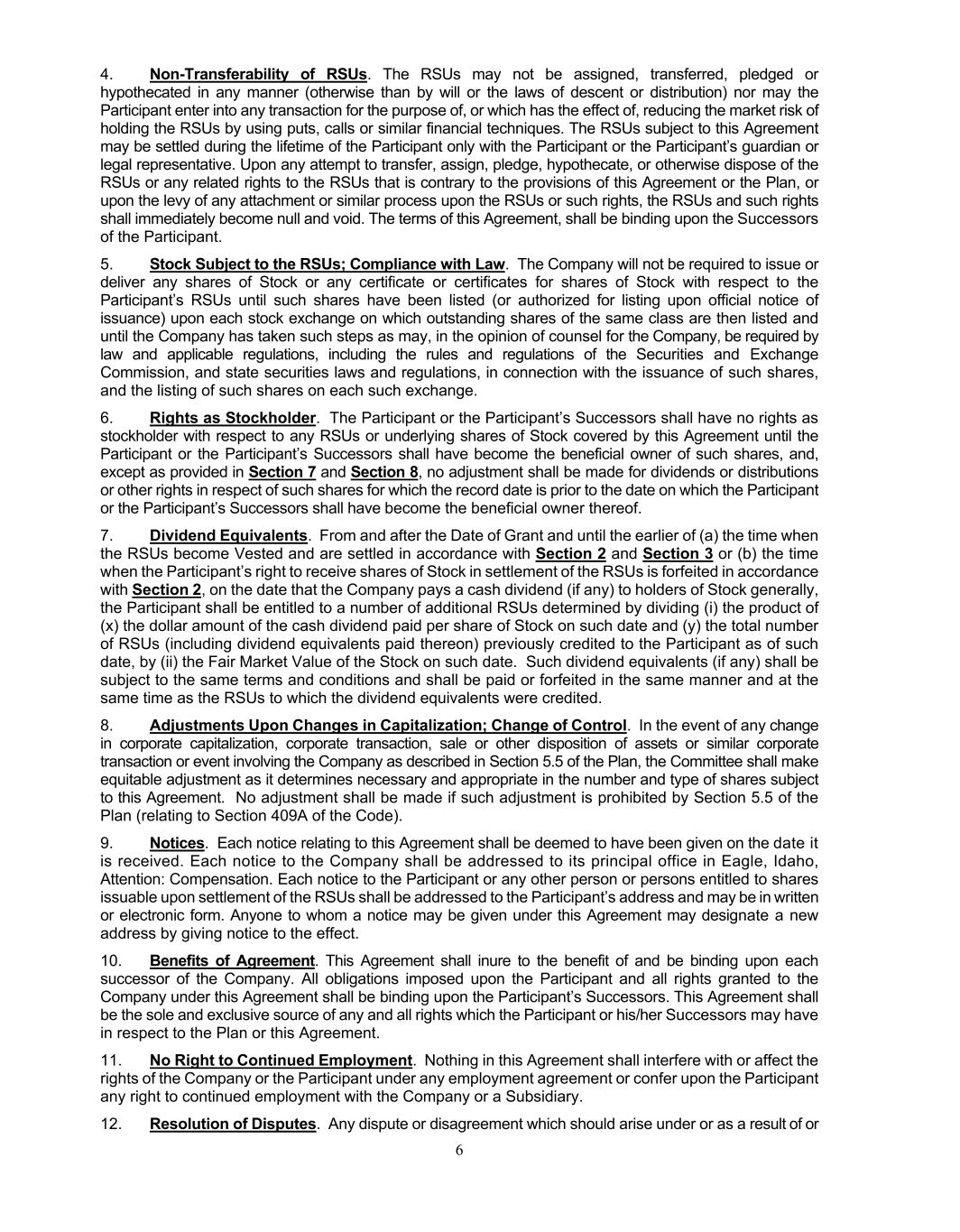 6 4. Non-Transferability of RSUs. The RSUs may not be assigned, transferred, pledged or hypothecated in any manner (otherwise than by will or the laws of descent or distribution) nor may the Participant enter into any transaction for the purpose of, or which has the effect of, reducing the market risk of holding the RSUs by using puts, calls or similar financial techniques. The RSUs subject to this Agreement may be settled during the lifetime of the Participant only with the Participant or the Participant’s guardian or legal representative. Upon any attempt to transfer, assign, pledge, hypothecate, or otherwise dispose of the RSUs or any related rights to the RSUs that is contrary to the provisions of this Agreement or the Plan, or upon the levy of any attachment or similar process upon the RSUs or such rights, the RSUs and such rights shall immediately become null and void. The terms of this Agreement, shall be binding upon the Successors of the Participant. 5. Stock Subject to the RSUs; Compliance with Law. The Company will not be required to issue or deliver any shares of Stock or any certificate or certificates for shares of Stock with respect to the Participant’s RSUs until such shares have been listed (or authorized for listing upon official notice of issuance) upon each stock exchange on which outstanding shares of the same class are then listed and until the Company has taken such steps as may, in the opinion of counsel for the Company, be required by law and applicable regulations, including the rules and regulations of the Securities and Exchange Commission, and state securities laws and regulations, in connection with the issuance of such shares, and the listing of such shares on each such exchange. 6. Rights as Stockholder. The Participant or the Participant’s Successors shall have no rights as stockholder with respect to any RSUs or underlying shares of Stock covered by this Agreement until the Participant or the Participant’s Successors shall have become the beneficial owner of such shares, and, except as provided in Section 7 and Section 8, no adjustment shall be made for dividends or distributions or other rights in respect of such shares for which the record date is prior to the date on which the Participant or the Participant’s Successors shall have become the beneficial owner thereof. 7. Dividend Equivalents. From and after the Date of Grant and until the earlier of (a) the time when the RSUs become Vested and are settled in accordance with Section 2 and Section 3 or (b) the time when the Participant’s right to receive shares of Stock in settlement of the RSUs is forfeited in accordance with Section 2, on the date that the Company pays a cash dividend (if any) to holders of Stock generally, the Participant shall be entitled to a number of additional RSUs determined by dividing (i) the product of (x) the dollar amount of the cash dividend paid per share of Stock on such date and (y) the total number of RSUs (including dividend equivalents paid thereon) previously credited to the Participant as of such date, by (ii) the Fair Market Value of the Stock on such date. Such dividend equivalents (if any) shall be subject to the same terms and conditions and shall be paid or forfeited in the same manner and at the same time as the RSUs to which the dividend equivalents were credited. 8. Adjustments Upon Changes in Capitalization; Change of Control. In the event of any change in corporate capitalization, corporate transaction, sale or other disposition of assets or similar corporate transaction or event involving the Company as described in Section 5.5 of the Plan, the Committee shall make equitable adjustment as it determines necessary and appropriate in the number and type of shares subject to this Agreement. No adjustment shall be made if such adjustment is prohibited by Section 5.5 of the Plan (relating to Section 409A of the Code). 9. Notices. Each notice relating to this Agreement shall be deemed to have been given on the date it is received. Each notice to the Company shall be addressed to its principal office in Eagle, Idaho, Attention: Compensation. Each notice to the Participant or any other person or persons entitled to shares issuable upon settlement of the RSUs shall be addressed to the Participant’s address and may be in written or electronic form. Anyone to whom a notice may be given under this Agreement may designate a new address by giving notice to the effect. 10. Benefits of Agreement. This Agreement shall inure to the benefit of and be binding upon each successor of the Company. All obligations imposed upon the Participant and all rights granted to the Company under this Agreement shall be binding upon the Participant’s Successors. This Agreement shall be the sole and exclusive source of any and all rights which the Participant or his/her Successors may have in respect to the Plan or this Agreement. 11. No Right to Continued Employment. Nothing in this Agreement shall interfere with or affect the rights of the Company or the Participant under any employment agreement or confer upon the Participant any right to continued employment with the Company or a Subsidiary. 12. Resolution of Disputes. Any dispute or disagreement which should arise under or as a result of or