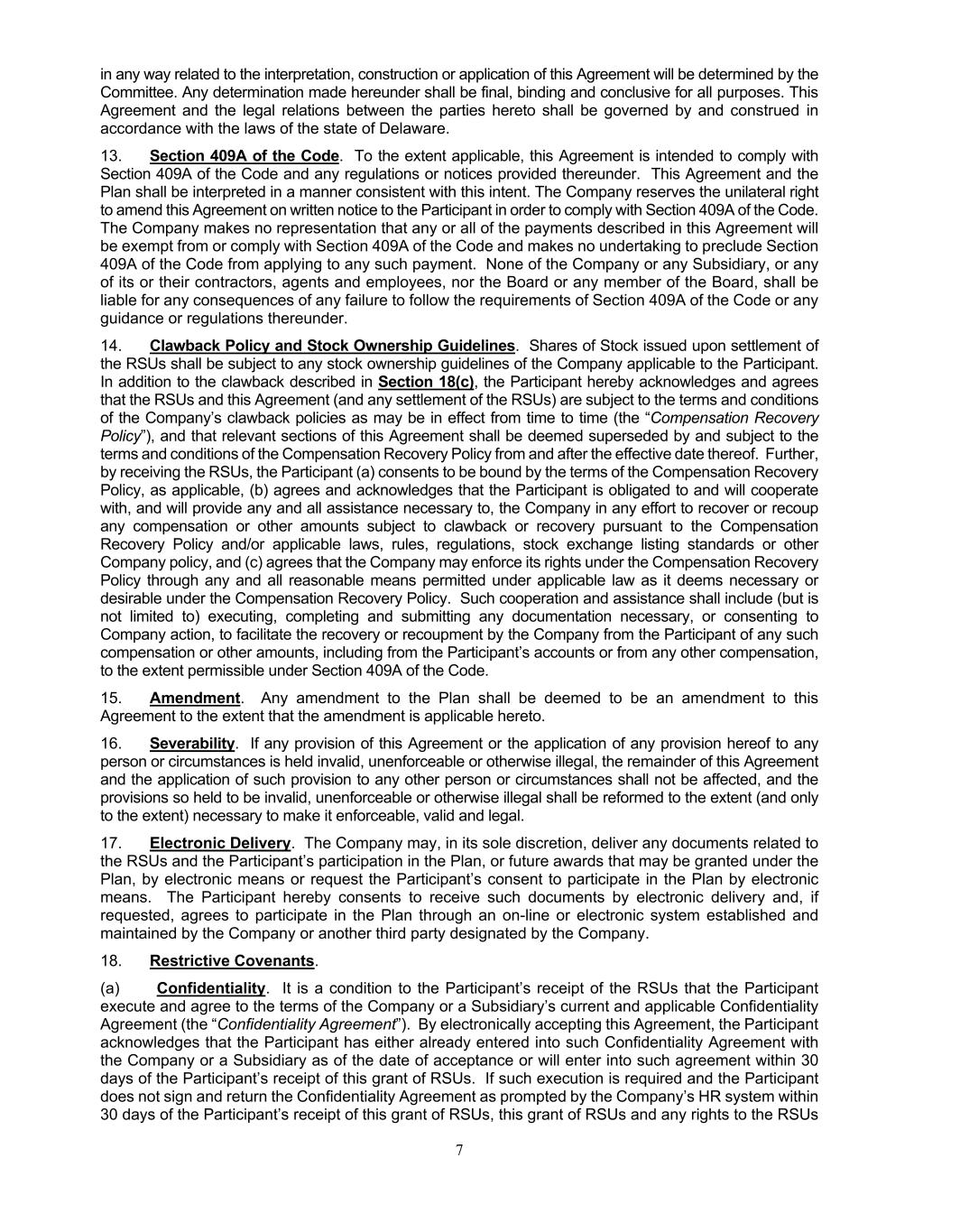 7 in any way related to the interpretation, construction or application of this Agreement will be determined by the Committee. Any determination made hereunder shall be final, binding and conclusive for all purposes. This Agreement and the legal relations between the parties hereto shall be governed by and construed in accordance with the laws of the state of Delaware. 13. Section 409A of the Code. To the extent applicable, this Agreement is intended to comply with Section 409A of the Code and any regulations or notices provided thereunder. This Agreement and the Plan shall be interpreted in a manner consistent with this intent. The Company reserves the unilateral right to amend this Agreement on written notice to the Participant in order to comply with Section 409A of the Code. The Company makes no representation that any or all of the payments described in this Agreement will be exempt from or comply with Section 409A of the Code and makes no undertaking to preclude Section 409A of the Code from applying to any such payment. None of the Company or any Subsidiary, or any of its or their contractors, agents and employees, nor the Board or any member of the Board, shall be liable for any consequences of any failure to follow the requirements of Section 409A of the Code or any guidance or regulations thereunder. 14. Clawback Policy and Stock Ownership Guidelines. Shares of Stock issued upon settlement of the RSUs shall be subject to any stock ownership guidelines of the Company applicable to the Participant. In addition to the clawback described in Section 18(c), the Participant hereby acknowledges and agrees that the RSUs and this Agreement (and any settlement of the RSUs) are subject to the terms and conditions of the Company’s clawback policies as may be in effect from time to time (the “Compensation Recovery Policy”), and that relevant sections of this Agreement shall be deemed superseded by and subject to the terms and conditions of the Compensation Recovery Policy from and after the effective date thereof. Further, by receiving the RSUs, the Participant (a) consents to be bound by the terms of the Compensation Recovery Policy, as applicable, (b) agrees and acknowledges that the Participant is obligated to and will cooperate with, and will provide any and all assistance necessary to, the Company in any effort to recover or recoup any compensation or other amounts subject to clawback or recovery pursuant to the Compensation Recovery Policy and/or applicable laws, rules, regulations, stock exchange listing standards or other Company policy, and (c) agrees that the Company may enforce its rights under the Compensation Recovery Policy through any and all reasonable means permitted under applicable law as it deems necessary or desirable under the Compensation Recovery Policy. Such cooperation and assistance shall include (but is not limited to) executing, completing and submitting any documentation necessary, or consenting to Company action, to facilitate the recovery or recoupment by the Company from the Participant of any such compensation or other amounts, including from the Participant’s accounts or from any other compensation, to the extent permissible under Section 409A of the Code. 15. Amendment. Any amendment to the Plan shall be deemed to be an amendment to this Agreement to the extent that the amendment is applicable hereto. 16. Severability. If any provision of this Agreement or the application of any provision hereof to any person or circumstances is held invalid, unenforceable or otherwise illegal, the remainder of this Agreement and the application of such provision to any other person or circumstances shall not be affected, and the provisions so held to be invalid, unenforceable or otherwise illegal shall be reformed to the extent (and only to the extent) necessary to make it enforceable, valid and legal. 17. Electronic Delivery. The Company may, in its sole discretion, deliver any documents related to the RSUs and the Participant’s participation in the Plan, or future awards that may be granted under the Plan, by electronic means or request the Participant’s consent to participate in the Plan by electronic means. The Participant hereby consents to receive such documents by electronic delivery and, if requested, agrees to participate in the Plan through an on-line or electronic system established and maintained by the Company or another third party designated by the Company. 18. Restrictive Covenants. (a) Confidentiality. It is a condition to the Participant’s receipt of the RSUs that the Participant execute and agree to the terms of the Company or a Subsidiary’s current and applicable Confidentiality Agreement (the “Confidentiality Agreement”). By electronically accepting this Agreement, the Participant acknowledges that the Participant has either already entered into such Confidentiality Agreement with the Company or a Subsidiary as of the date of acceptance or will enter into such agreement within 30 days of the Participant’s receipt of this grant of RSUs. If such execution is required and the Participant does not sign and return the Confidentiality Agreement as prompted by the Company’s HR system within 30 days of the Participant’s receipt of this grant of RSUs, this grant of RSUs and any rights to the RSUs