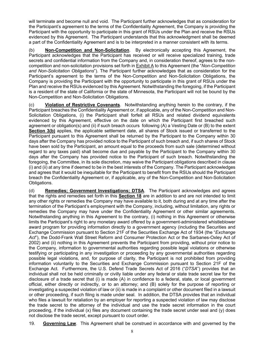 8 will terminate and become null and void. The Participant further acknowledges that as consideration for the Participant’s agreement to the terms of the Confidentiality Agreement, the Company is providing the Participant with the opportunity to participate in this grant of RSUs under the Plan and receive the RSUs evidenced by this Agreement. The Participant understands that this acknowledgment shall be deemed a part of the Confidentiality Agreement and is to be interpreted in a manner consistent with its terms. (b) Non-Competition and Non-Solicitation. By electronically accepting this Agreement, the Participant acknowledges that the Participant has received or will receive specialized training, trade secrets and confidential information from the Company and, in consideration thereof, agrees to the non- competition and non-solicitation provisions set forth in Exhibit A to this Agreement (the “Non-Competition and Non-Solicitation Obligations”). The Participant further acknowledges that as consideration for the Participant’s agreement to the terms of the Non-Competition and Non-Solicitation Obligations, the Company is providing the Participant with the opportunity to participate in this grant of RSUs under the Plan and receive the RSUs evidenced by this Agreement. Notwithstanding the foregoing, if the Participant is a resident of the state of California or the state of Minnesota, the Participant will not be bound by the Non-Competition and Non-Solicitation Obligations. (c) Violation of Restrictive Covenants. Notwithstanding anything herein to the contrary, if the Participant breaches the Confidentiality Agreement or, if applicable, any of the Non-Competition and Non- Solicitation Obligations, (i) the Participant shall forfeit all RSUs and related dividend equivalents evidenced by this Agreement, effective on the date on which the Participant first breached such agreement or obligation(s) and (ii) if such breach occurs following (A) a Vesting Date or (B) to the extent Section 3(b) applies, the applicable settlement date, all shares of Stock issued or transferred to the Participant pursuant to this Agreement shall be returned by the Participant to the Company within 30 days after the Company has provided notice to the Participant of such breach and, if such shares of Stock have been sold by the Participant, an amount equal to the proceeds from such sale (determined without regard to any taxes paid) shall become due and payable by the Participant to the Company within 30 days after the Company has provided notice to the Participant of such breach. Notwithstanding the foregoing, the Committee, in its sole discretion, may waive the Participant obligations described in clause (i) and (ii) at any time if deemed to be in the best interests of the Company. The Participant acknowledges and agrees that it would be inequitable for the Participant to benefit from the RSUs should the Participant breach the Confidentiality Agreement or, if applicable, any of the Non-Competition and Non-Solicitation Obligations. (d) Remedies; Government Investigations; DTSA. The Participant acknowledges and agrees that the rights and remedies set forth in this Section 18 are in addition to and are not intended to limit any other rights or remedies the Company may have available to it, both during and at any time after the termination of the Participant’s employment with the Company, including, without limitation, any rights or remedies the Company may have under the Confidentiality Agreement or other similar agreements. Notwithstanding anything in this Agreement to the contrary, (i) nothing in this Agreement or otherwise limits the Participant’s right to any monetary award offered by a government-administered whistleblower award program for providing information directly to a government agency (including the Securities and Exchange Commission pursuant to Section 21F of the Securities Exchange Act of 1934 (the “Exchange Act”), the Dodd-Frank Wall Street Reform and Consumer Protection Act or the Sarbanes-Oxley Act of 2002) and (ii) nothing in this Agreement prevents the Participant from providing, without prior notice to the Company, information to governmental authorities regarding possible legal violations or otherwise testifying or participating in any investigation or proceeding by any governmental authorities regarding possible legal violations, and, for purpose of clarity, the Participant is not prohibited from providing information voluntarily to the Securities and Exchange Commission pursuant to Section 21F of the Exchange Act. Furthermore, the U.S. Defend Trade Secrets Act of 2016 (“DTSA”) provides that an individual shall not be held criminally or civilly liable under any federal or state trade secret law for the disclosure of a trade secret that (i) is made (A) in confidence to a federal, state, or local government official, either directly or indirectly, or to an attorney; and (B) solely for the purpose of reporting or investigating a suspected violation of law or (ii) is made in a complaint or other document filed in a lawsuit or other proceeding, if such filing is made under seal. In addition, the DTSA provides that an individual who files a lawsuit for retaliation by an employer for reporting a suspected violation of law may disclose the trade secret to the attorney of the individual and use the trade secret information in the court proceeding, if the individual (x) files any document containing the trade secret under seal and (y) does not disclose the trade secret, except pursuant to court order. 19. Governing Law. This Agreement shall be construed in accordance with and governed by the
