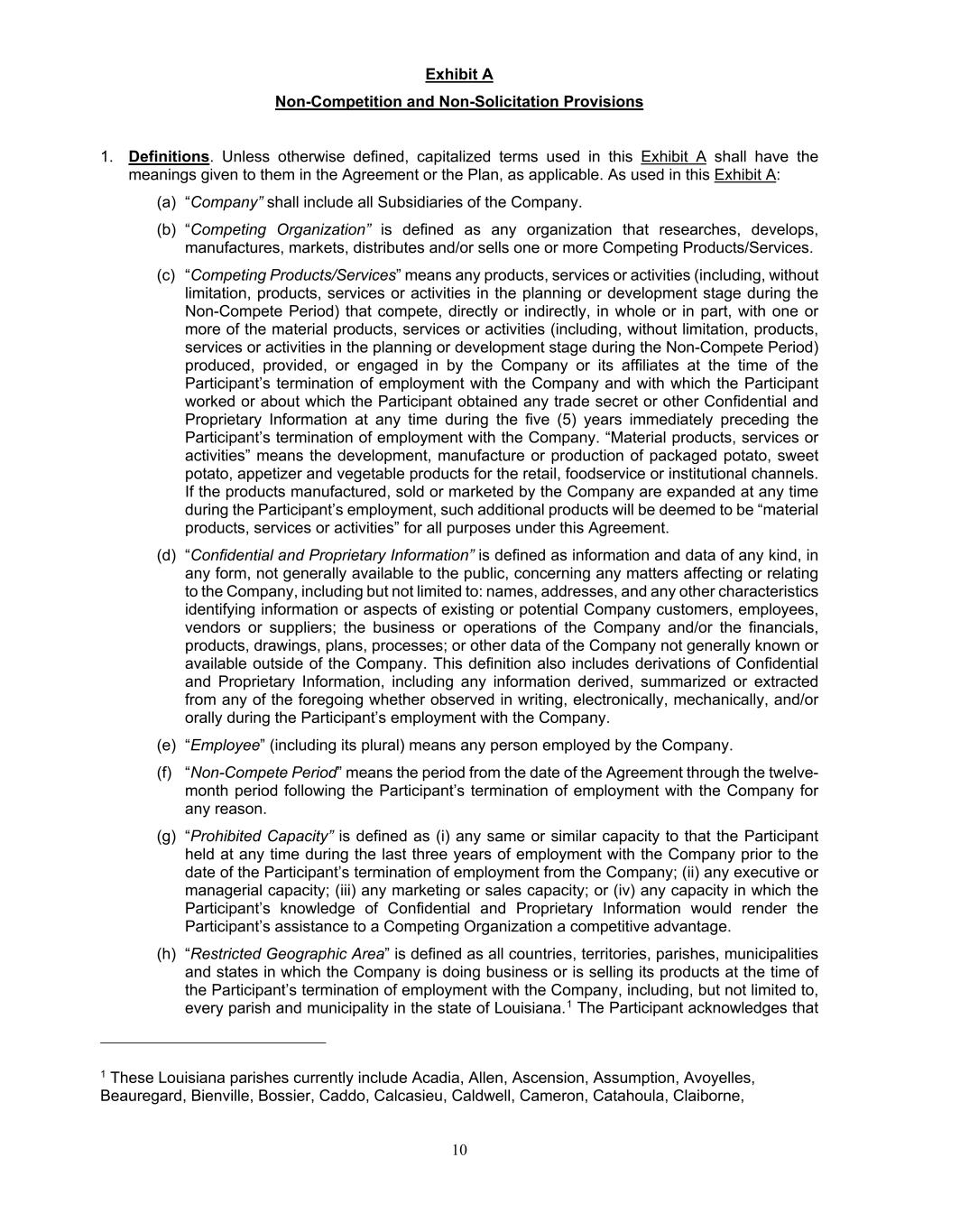 10 Exhibit A Non-Competition and Non-Solicitation Provisions 1. Definitions. Unless otherwise defined, capitalized terms used in this Exhibit A shall have the meanings given to them in the Agreement or the Plan, as applicable. As used in this Exhibit A: (a) “Company” shall include all Subsidiaries of the Company. (b) “Competing Organization” is defined as any organization that researches, develops, manufactures, markets, distributes and/or sells one or more Competing Products/Services. (c) “Competing Products/Services” means any products, services or activities (including, without limitation, products, services or activities in the planning or development stage during the Non-Compete Period) that compete, directly or indirectly, in whole or in part, with one or more of the material products, services or activities (including, without limitation, products, services or activities in the planning or development stage during the Non-Compete Period) produced, provided, or engaged in by the Company or its affiliates at the time of the Participant’s termination of employment with the Company and with which the Participant worked or about which the Participant obtained any trade secret or other Confidential and Proprietary Information at any time during the five (5) years immediately preceding the Participant’s termination of employment with the Company. “Material products, services or activities” means the development, manufacture or production of packaged potato, sweet potato, appetizer and vegetable products for the retail, foodservice or institutional channels. If the products manufactured, sold or marketed by the Company are expanded at any time during the Participant’s employment, such additional products will be deemed to be “material products, services or activities” for all purposes under this Agreement. (d) “Confidential and Proprietary Information” is defined as information and data of any kind, in any form, not generally available to the public, concerning any matters affecting or relating to the Company, including but not limited to: names, addresses, and any other characteristics identifying information or aspects of existing or potential Company customers, employees, vendors or suppliers; the business or operations of the Company and/or the financials, products, drawings, plans, processes; or other data of the Company not generally known or available outside of the Company. This definition also includes derivations of Confidential and Proprietary Information, including any information derived, summarized or extracted from any of the foregoing whether observed in writing, electronically, mechanically, and/or orally during the Participant’s employment with the Company. (e) “Employee” (including its plural) means any person employed by the Company. (f) “Non-Compete Period” means the period from the date of the Agreement through the twelve- month period following the Participant’s termination of employment with the Company for any reason. (g) “Prohibited Capacity” is defined as (i) any same or similar capacity to that the Participant held at any time during the last three years of employment with the Company prior to the date of the Participant’s termination of employment from the Company; (ii) any executive or managerial capacity; (iii) any marketing or sales capacity; or (iv) any capacity in which the Participant’s knowledge of Confidential and Proprietary Information would render the Participant’s assistance to a Competing Organization a competitive advantage. (h) “Restricted Geographic Area” is defined as all countries, territories, parishes, municipalities and states in which the Company is doing business or is selling its products at the time of the Participant’s termination of employment with the Company, including, but not limited to, every parish and municipality in the state of Louisiana.1 The Participant acknowledges that 1 These Louisiana parishes currently include Acadia, Allen, Ascension, Assumption, Avoyelles, Beauregard, Bienville, Bossier, Caddo, Calcasieu, Caldwell, Cameron, Catahoula, Claiborne,