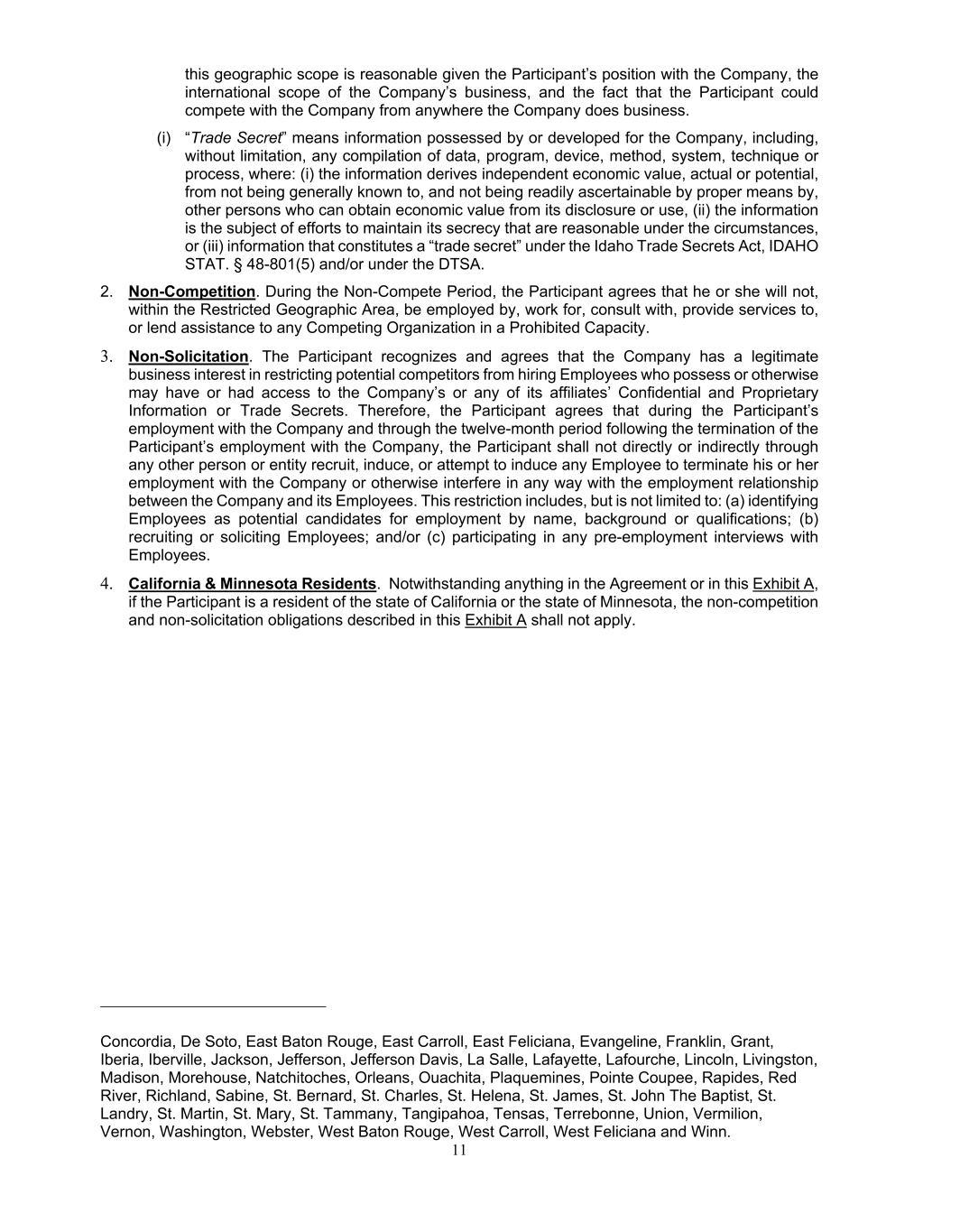 11 this geographic scope is reasonable given the Participant’s position with the Company, the international scope of the Company’s business, and the fact that the Participant could compete with the Company from anywhere the Company does business. (i) “Trade Secret” means information possessed by or developed for the Company, including, without limitation, any compilation of data, program, device, method, system, technique or process, where: (i) the information derives independent economic value, actual or potential, from not being generally known to, and not being readily ascertainable by proper means by, other persons who can obtain economic value from its disclosure or use, (ii) the information is the subject of efforts to maintain its secrecy that are reasonable under the circumstances, or (iii) information that constitutes a “trade secret” under the Idaho Trade Secrets Act, IDAHO STAT. § 48-801(5) and/or under the DTSA. 2. Non-Competition. During the Non-Compete Period, the Participant agrees that he or she will not, within the Restricted Geographic Area, be employed by, work for, consult with, provide services to, or lend assistance to any Competing Organization in a Prohibited Capacity. 3. Non-Solicitation. The Participant recognizes and agrees that the Company has a legitimate business interest in restricting potential competitors from hiring Employees who possess or otherwise may have or had access to the Company’s or any of its affiliates’ Confidential and Proprietary Information or Trade Secrets. Therefore, the Participant agrees that during the Participant’s employment with the Company and through the twelve-month period following the termination of the Participant’s employment with the Company, the Participant shall not directly or indirectly through any other person or entity recruit, induce, or attempt to induce any Employee to terminate his or her employment with the Company or otherwise interfere in any way with the employment relationship between the Company and its Employees. This restriction includes, but is not limited to: (a) identifying Employees as potential candidates for employment by name, background or qualifications; (b) recruiting or soliciting Employees; and/or (c) participating in any pre-employment interviews with Employees. 4. California & Minnesota Residents. Notwithstanding anything in the Agreement or in this Exhibit A, if the Participant is a resident of the state of California or the state of Minnesota, the non-competition and non-solicitation obligations described in this Exhibit A shall not apply. Concordia, De Soto, East Baton Rouge, East Carroll, East Feliciana, Evangeline, Franklin, Grant, Iberia, Iberville, Jackson, Jefferson, Jefferson Davis, La Salle, Lafayette, Lafourche, Lincoln, Livingston, Madison, Morehouse, Natchitoches, Orleans, Ouachita, Plaquemines, Pointe Coupee, Rapides, Red River, Richland, Sabine, St. Bernard, St. Charles, St. Helena, St. James, St. John The Baptist, St. Landry, St. Martin, St. Mary, St. Tammany, Tangipahoa, Tensas, Terrebonne, Union, Vermilion, Vernon, Washington, Webster, West Baton Rouge, West Carroll, West Feliciana and Winn.