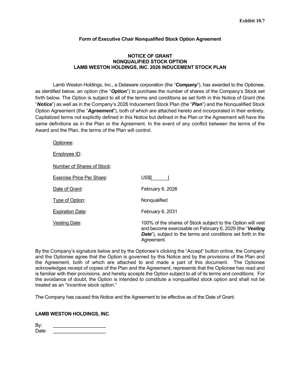Exhibit 10.7 Form of Executive Chair Nonqualified Stock Option Agreement NOTICE OF GRANT NONQUALIFIED STOCK OPTION LAMB WESTON HOLDINGS, INC. 2026 INDUCEMENT STOCK PLAN Lamb Weston Holdings, Inc., a Delaware corporation (the “Company”), has awarded to the Optionee, as identified below, an option (the “Option”) to purchase the number of shares of the Company’s Stock set forth below. The Option is subject to all of the terms and conditions as set forth in this Notice of Grant (the “Notice”) as well as in the Company’s 2026 Inducement Stock Plan (the “Plan”) and the Nonqualified Stock Option Agreement (the “Agreement”), both of which are attached hereto and incorporated in their entirety. Capitalized terms not explicitly defined in this Notice but defined in the Plan or the Agreement will have the same definitions as in the Plan or the Agreement. In the event of any conflict between the terms of the Award and the Plan, the terms of the Plan will control. Optionee: Employee ID: Number of Shares of Stock: Exercise Price Per Share: US$[______] Date of Grant: February 6, 2026 Type of Option: Nonqualified Expiration Date: February 6, 2031 Vesting Date: 100% of the shares of Stock subject to the Option will vest and become exercisable on February 6, 2029 (the “Vesting Date”), subject to the terms and conditions set forth in the Agreement. By the Company’s signature below and by the Optionee’s clicking the “Accept” button online, the Company and the Optionee agree that the Option is governed by this Notice and by the provisions of the Plan and the Agreement, both of which are attached to and made a part of this document. The Optionee acknowledges receipt of copies of the Plan and the Agreement, represents that the Optionee has read and is familiar with their provisions, and hereby accepts the Option subject to all of its terms and conditions. For the avoidance of doubt, the Option is intended to constitute a nonqualified stock option and shall not be treated as an “incentive stock option.” The Company has caused this Notice and the Agreement to be effective as of the Date of Grant. LAMB WESTON HOLDINGS, INC. By: Date: