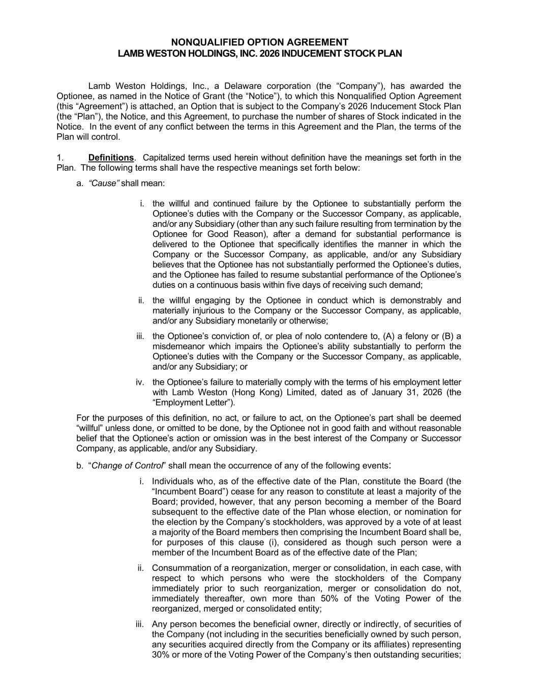 NONQUALIFIED OPTION AGREEMENT LAMB WESTON HOLDINGS, INC. 2026 INDUCEMENT STOCK PLAN Lamb Weston Holdings, Inc., a Delaware corporation (the “Company”), has awarded the Optionee, as named in the Notice of Grant (the “Notice”), to which this Nonqualified Option Agreement (this “Agreement”) is attached, an Option that is subject to the Company’s 2026 Inducement Stock Plan (the “Plan”), the Notice, and this Agreement, to purchase the number of shares of Stock indicated in the Notice. In the event of any conflict between the terms in this Agreement and the Plan, the terms of the Plan will control. 1. Definitions. Capitalized terms used herein without definition have the meanings set forth in the Plan. The following terms shall have the respective meanings set forth below: a. “Cause” shall mean: i. the willful and continued failure by the Optionee to substantially perform the Optionee’s duties with the Company or the Successor Company, as applicable, and/or any Subsidiary (other than any such failure resulting from termination by the Optionee for Good Reason), after a demand for substantial performance is delivered to the Optionee that specifically identifies the manner in which the Company or the Successor Company, as applicable, and/or any Subsidiary believes that the Optionee has not substantially performed the Optionee’s duties, and the Optionee has failed to resume substantial performance of the Optionee’s duties on a continuous basis within five days of receiving such demand; ii. the willful engaging by the Optionee in conduct which is demonstrably and materially injurious to the Company or the Successor Company, as applicable, and/or any Subsidiary monetarily or otherwise; iii. the Optionee’s conviction of, or plea of nolo contendere to, (A) a felony or (B) a misdemeanor which impairs the Optionee’s ability substantially to perform the Optionee’s duties with the Company or the Successor Company, as applicable, and/or any Subsidiary; or iv. the Optionee’s failure to materially comply with the terms of his employment letter with Lamb Weston (Hong Kong) Limited, dated as of January 31, 2026 (the “Employment Letter”). For the purposes of this definition, no act, or failure to act, on the Optionee’s part shall be deemed “willful” unless done, or omitted to be done, by the Optionee not in good faith and without reasonable belief that the Optionee’s action or omission was in the best interest of the Company or Successor Company, as applicable, and/or any Subsidiary. b. “Change of Control” shall mean the occurrence of any of the following events: i. Individuals who, as of the effective date of the Plan, constitute the Board (the “Incumbent Board”) cease for any reason to constitute at least a majority of the Board; provided, however, that any person becoming a member of the Board subsequent to the effective date of the Plan whose election, or nomination for the election by the Company’s stockholders, was approved by a vote of at least a majority of the Board members then comprising the Incumbent Board shall be, for purposes of this clause (i), considered as though such person were a member of the Incumbent Board as of the effective date of the Plan; ii. Consummation of a reorganization, merger or consolidation, in each case, with respect to which persons who were the stockholders of the Company immediately prior to such reorganization, merger or consolidation do not, immediately thereafter, own more than 50% of the Voting Power of the reorganized, merged or consolidated entity; iii. Any person becomes the beneficial owner, directly or indirectly, of securities of the Company (not including in the securities beneficially owned by such person, any securities acquired directly from the Company or its affiliates) representing 30% or more of the Voting Power of the Company’s then outstanding securities;
