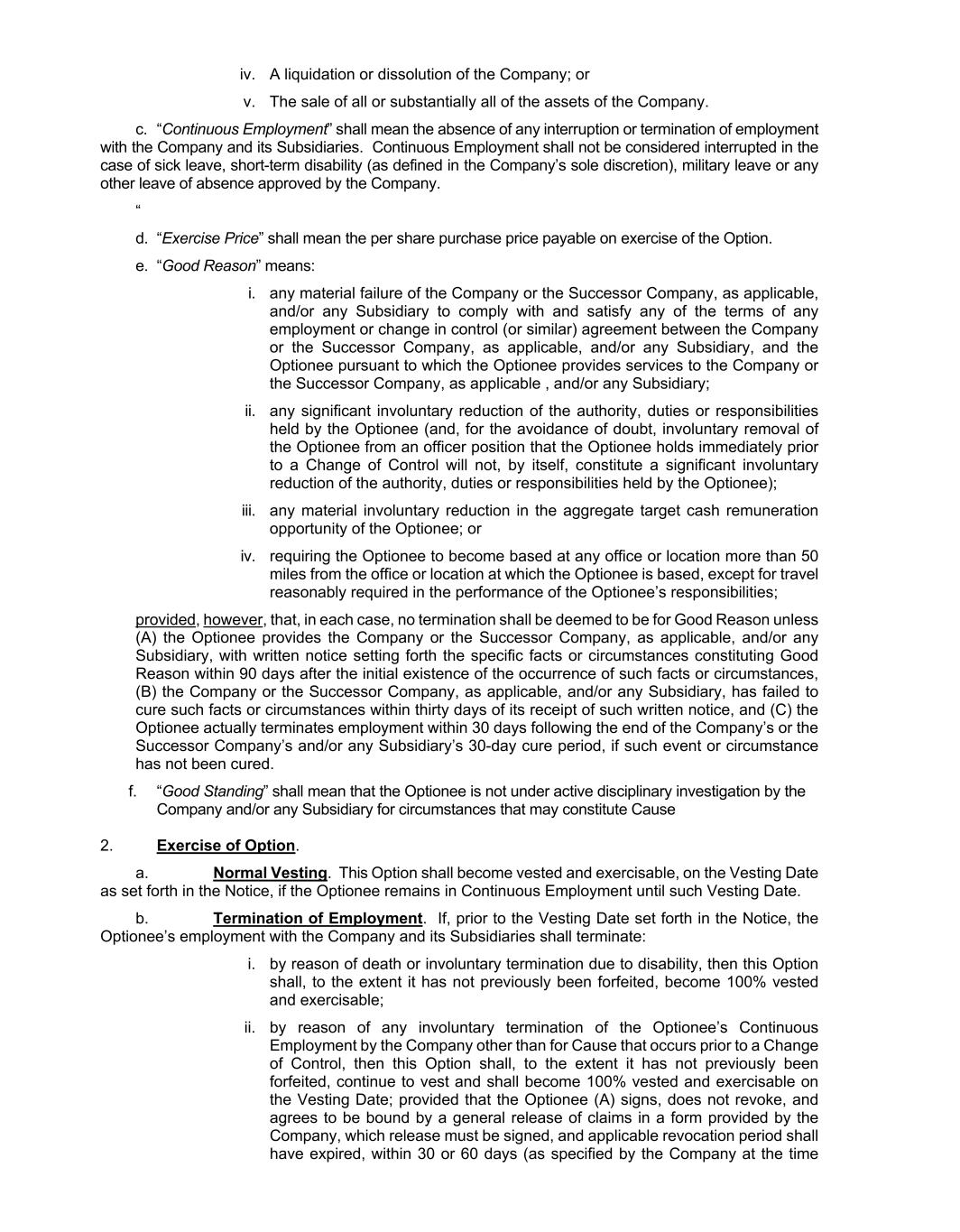 iv. A liquidation or dissolution of the Company; or v. The sale of all or substantially all of the assets of the Company. c. “Continuous Employment” shall mean the absence of any interruption or termination of employment with the Company and its Subsidiaries. Continuous Employment shall not be considered interrupted in the case of sick leave, short-term disability (as defined in the Company’s sole discretion), military leave or any other leave of absence approved by the Company. “ d. “Exercise Price” shall mean the per share purchase price payable on exercise of the Option. e. “Good Reason” means: i. any material failure of the Company or the Successor Company, as applicable, and/or any Subsidiary to comply with and satisfy any of the terms of any employment or change in control (or similar) agreement between the Company or the Successor Company, as applicable, and/or any Subsidiary, and the Optionee pursuant to which the Optionee provides services to the Company or the Successor Company, as applicable , and/or any Subsidiary; ii. any significant involuntary reduction of the authority, duties or responsibilities held by the Optionee (and, for the avoidance of doubt, involuntary removal of the Optionee from an officer position that the Optionee holds immediately prior to a Change of Control will not, by itself, constitute a significant involuntary reduction of the authority, duties or responsibilities held by the Optionee); iii. any material involuntary reduction in the aggregate target cash remuneration opportunity of the Optionee; or iv. requiring the Optionee to become based at any office or location more than 50 miles from the office or location at which the Optionee is based, except for travel reasonably required in the performance of the Optionee’s responsibilities; provided, however, that, in each case, no termination shall be deemed to be for Good Reason unless (A) the Optionee provides the Company or the Successor Company, as applicable, and/or any Subsidiary, with written notice setting forth the specific facts or circumstances constituting Good Reason within 90 days after the initial existence of the occurrence of such facts or circumstances, (B) the Company or the Successor Company, as applicable, and/or any Subsidiary, has failed to cure such facts or circumstances within thirty days of its receipt of such written notice, and (C) the Optionee actually terminates employment within 30 days following the end of the Company’s or the Successor Company’s and/or any Subsidiary’s 30-day cure period, if such event or circumstance has not been cured. f. “Good Standing” shall mean that the Optionee is not under active disciplinary investigation by the Company and/or any Subsidiary for circumstances that may constitute Cause 2. Exercise of Option. a. Normal Vesting. This Option shall become vested and exercisable, on the Vesting Date as set forth in the Notice, if the Optionee remains in Continuous Employment until such Vesting Date. b. Termination of Employment. If, prior to the Vesting Date set forth in the Notice, the Optionee’s employment with the Company and its Subsidiaries shall terminate: i. by reason of death or involuntary termination due to disability, then this Option shall, to the extent it has not previously been forfeited, become 100% vested and exercisable; ii. by reason of any involuntary termination of the Optionee’s Continuous Employment by the Company other than for Cause that occurs prior to a Change of Control, then this Option shall, to the extent it has not previously been forfeited, continue to vest and shall become 100% vested and exercisable on the Vesting Date; provided that the Optionee (A) signs, does not revoke, and agrees to be bound by a general release of claims in a form provided by the Company, which release must be signed, and applicable revocation period shall have expired, within 30 or 60 days (as specified by the Company at the time
