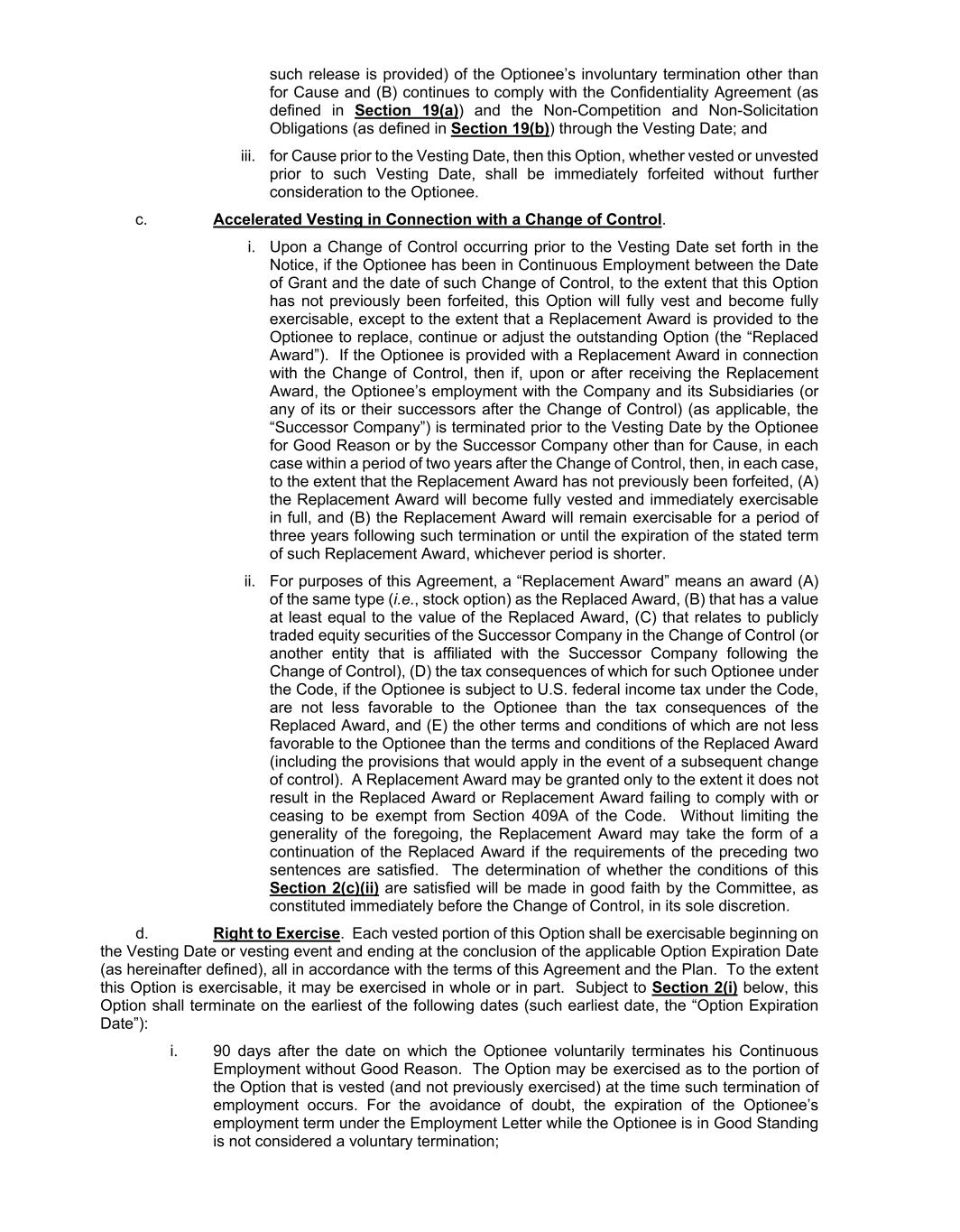 such release is provided) of the Optionee’s involuntary termination other than for Cause and (B) continues to comply with the Confidentiality Agreement (as defined in Section 19(a)) and the Non-Competition and Non-Solicitation Obligations (as defined in Section 19(b)) through the Vesting Date; and iii. for Cause prior to the Vesting Date, then this Option, whether vested or unvested prior to such Vesting Date, shall be immediately forfeited without further consideration to the Optionee. c. Accelerated Vesting in Connection with a Change of Control. i. Upon a Change of Control occurring prior to the Vesting Date set forth in the Notice, if the Optionee has been in Continuous Employment between the Date of Grant and the date of such Change of Control, to the extent that this Option has not previously been forfeited, this Option will fully vest and become fully exercisable, except to the extent that a Replacement Award is provided to the Optionee to replace, continue or adjust the outstanding Option (the “Replaced Award”). If the Optionee is provided with a Replacement Award in connection with the Change of Control, then if, upon or after receiving the Replacement Award, the Optionee’s employment with the Company and its Subsidiaries (or any of its or their successors after the Change of Control) (as applicable, the “Successor Company”) is terminated prior to the Vesting Date by the Optionee for Good Reason or by the Successor Company other than for Cause, in each case within a period of two years after the Change of Control, then, in each case, to the extent that the Replacement Award has not previously been forfeited, (A) the Replacement Award will become fully vested and immediately exercisable in full, and (B) the Replacement Award will remain exercisable for a period of three years following such termination or until the expiration of the stated term of such Replacement Award, whichever period is shorter. ii. For purposes of this Agreement, a “Replacement Award” means an award (A) of the same type (i.e., stock option) as the Replaced Award, (B) that has a value at least equal to the value of the Replaced Award, (C) that relates to publicly traded equity securities of the Successor Company in the Change of Control (or another entity that is affiliated with the Successor Company following the Change of Control), (D) the tax consequences of which for such Optionee under the Code, if the Optionee is subject to U.S. federal income tax under the Code, are not less favorable to the Optionee than the tax consequences of the Replaced Award, and (E) the other terms and conditions of which are not less favorable to the Optionee than the terms and conditions of the Replaced Award (including the provisions that would apply in the event of a subsequent change of control). A Replacement Award may be granted only to the extent it does not result in the Replaced Award or Replacement Award failing to comply with or ceasing to be exempt from Section 409A of the Code. Without limiting the generality of the foregoing, the Replacement Award may take the form of a continuation of the Replaced Award if the requirements of the preceding two sentences are satisfied. The determination of whether the conditions of this Section 2(c)(ii) are satisfied will be made in good faith by the Committee, as constituted immediately before the Change of Control, in its sole discretion. d. Right to Exercise. Each vested portion of this Option shall be exercisable beginning on the Vesting Date or vesting event and ending at the conclusion of the applicable Option Expiration Date (as hereinafter defined), all in accordance with the terms of this Agreement and the Plan. To the extent this Option is exercisable, it may be exercised in whole or in part. Subject to Section 2(i) below, this Option shall terminate on the earliest of the following dates (such earliest date, the “Option Expiration Date”): i. 90 days after the date on which the Optionee voluntarily terminates his Continuous Employment without Good Reason. The Option may be exercised as to the portion of the Option that is vested (and not previously exercised) at the time such termination of employment occurs. For the avoidance of doubt, the expiration of the Optionee’s employment term under the Employment Letter while the Optionee is in Good Standing is not considered a voluntary termination;
