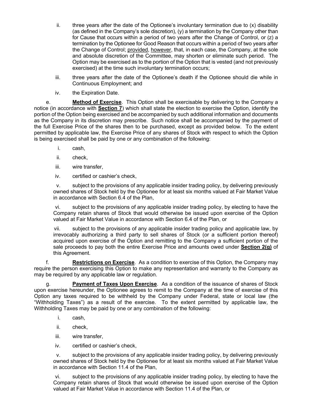 ii. three years after the date of the Optionee’s involuntary termination due to (x) disability (as defined in the Company’s sole discretion), (y) a termination by the Company other than for Cause that occurs within a period of two years after the Change of Control, or (z) a termination by the Optionee for Good Reason that occurs within a period of two years after the Change of Control; provided, however, that, in each case, the Company, at the sole and absolute discretion of the Committee, may shorten or eliminate such period. The Option may be exercised as to the portion of the Option that is vested (and not previously exercised) at the time such involuntary termination occurs; iii. three years after the date of the Optionee’s death if the Optionee should die while in Continuous Employment; and iv. the Expiration Date. e. Method of Exercise. This Option shall be exercisable by delivering to the Company a notice (in accordance with Section 7) which shall state the election to exercise the Option, identify the portion of the Option being exercised and be accompanied by such additional information and documents as the Company in its discretion may prescribe. Such notice shall be accompanied by the payment of the full Exercise Price of the shares then to be purchased, except as provided below. To the extent permitted by applicable law, the Exercise Price of any shares of Stock with respect to which the Option is being exercised shall be paid by one or any combination of the following: i. cash, ii. check, iii. wire transfer, iv. certified or cashier’s check, v. subject to the provisions of any applicable insider trading policy, by delivering previously owned shares of Stock held by the Optionee for at least six months valued at Fair Market Value in accordance with Section 6.4 of the Plan, vi. subject to the provisions of any applicable insider trading policy, by electing to have the Company retain shares of Stock that would otherwise be issued upon exercise of the Option valued at Fair Market Value in accordance with Section 6.4 of the Plan, or vii. subject to the provisions of any applicable insider trading policy and applicable law, by irrevocably authorizing a third party to sell shares of Stock (or a sufficient portion thereof) acquired upon exercise of the Option and remitting to the Company a sufficient portion of the sale proceeds to pay both the entire Exercise Price and amounts owed under Section 2(g) of this Agreement. f. Restrictions on Exercise. As a condition to exercise of this Option, the Company may require the person exercising this Option to make any representation and warranty to the Company as may be required by any applicable law or regulation. g. Payment of Taxes Upon Exercise. As a condition of the issuance of shares of Stock upon exercise hereunder, the Optionee agrees to remit to the Company at the time of exercise of this Option any taxes required to be withheld by the Company under Federal, state or local law (the “Withholding Taxes”) as a result of the exercise. To the extent permitted by applicable law, the Withholding Taxes may be paid by one or any combination of the following: i. cash, ii. check, iii. wire transfer, iv. certified or cashier’s check, v. subject to the provisions of any applicable insider trading policy, by delivering previously owned shares of Stock held by the Optionee for at least six months valued at Fair Market Value in accordance with Section 11.4 of the Plan, vi. subject to the provisions of any applicable insider trading policy, by electing to have the Company retain shares of Stock that would otherwise be issued upon exercise of the Option valued at Fair Market Value in accordance with Section 11.4 of the Plan, or